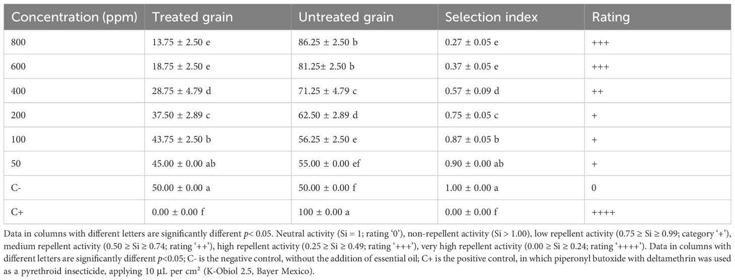 The quality and efficacy of essential oils can be influenced by multiple factors, including the timing of leaf harvest, the plant part used, extraction method, plant origin, and variability in chemical composition. Genetic, environmental, and phenological factors, as well as post-harvest handling, can affect concentrations of bioactive compounds. Storage conditions also influence the stability of essential oil constituents. Such variability can lead to different chemotypes, which may affect the efficacy of oils in integrated pest management strategies (Granados-Echegoyen et al., 2017; Ferreira et al., 2020; Jayasundara and Arampath, 2021). Similar patterns have been observed in Porophyllum linaria Cav., where higher concentrations of active compounds correlated with enhanced bioactivity (Hernández-Cruz et al., 2019; Landero-Valenzuela et al., 2022). These observations support our finding that pest repellency improves with increasing essential oil concentration and prolonged exposure.