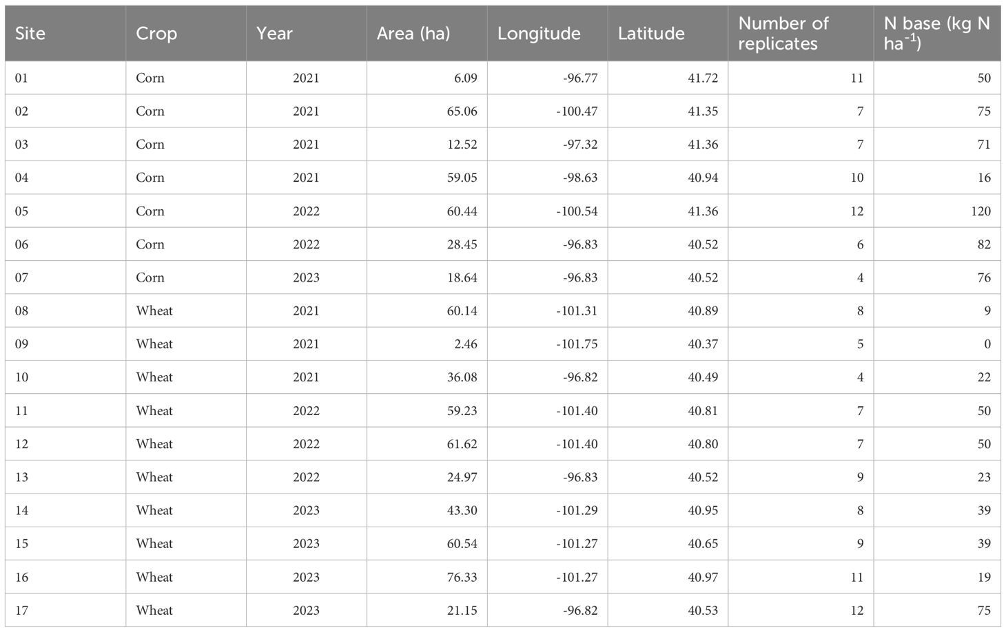 Data collected for each site-year included grain yield (t ha-1) and total N rate applied (kg N ha-1), which were used to calculate nitrogen use efficiency (NUE) as partial factor productivity (kg yield kg-1 N-1) (Congreves et al., 2021). The number of replicates varied from 4 to 12 in each trial. Experimental areas ranged from 2.7 ha to 78.2 ha. Field management decisions, including N application before sensing (N base), were determined by the farmers. All sites received an N base rate, followed by the establishment of the in-season strips for the experiment. For corn, N base rates ranged from 16 to 120 kg N ha-1, with an average of 70 kg N ha-1. For wheat, base N rates ranged from 0 to 75 kg N ha-1, averaging 32 kg N-1 (Table 1).