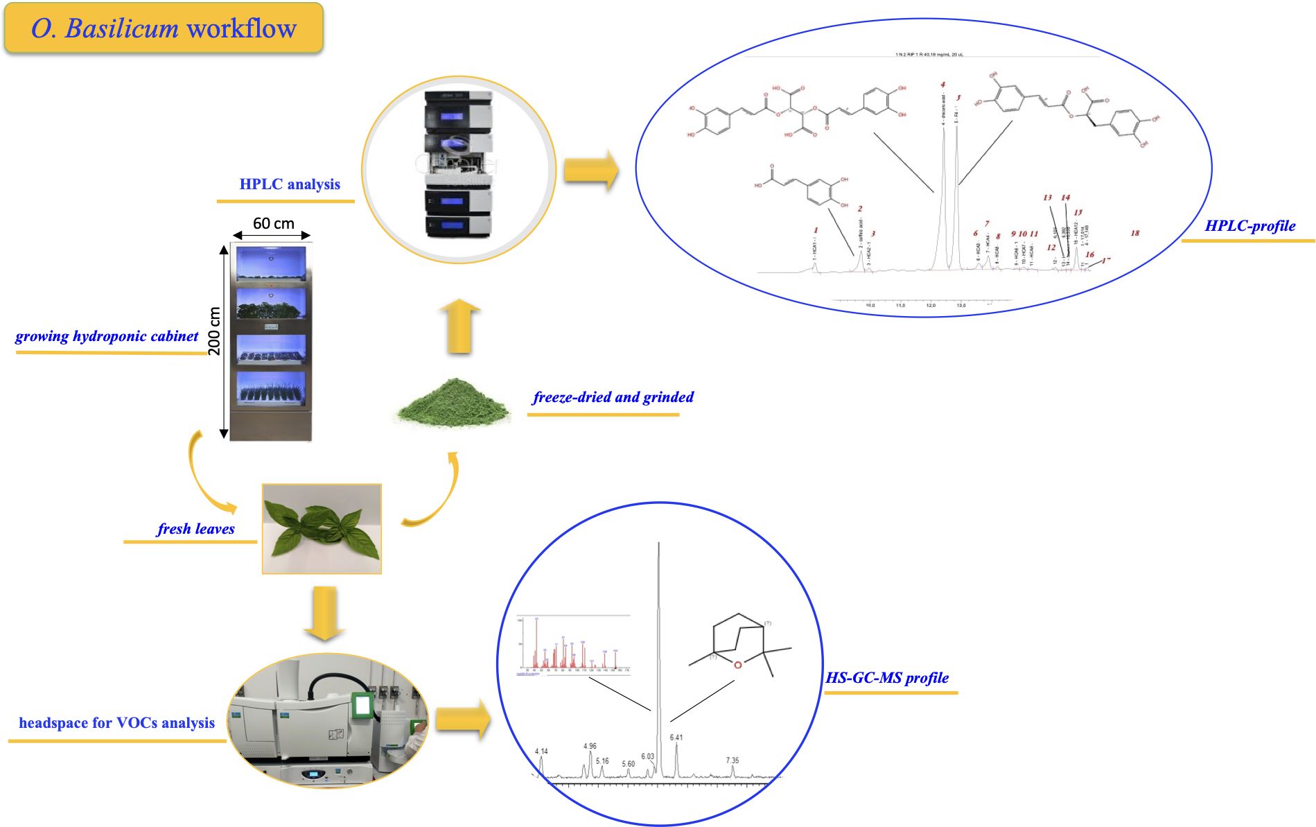 Keywords: basil leaves, light exposure dependent growth, HPLC-UV, head space, polyphenols