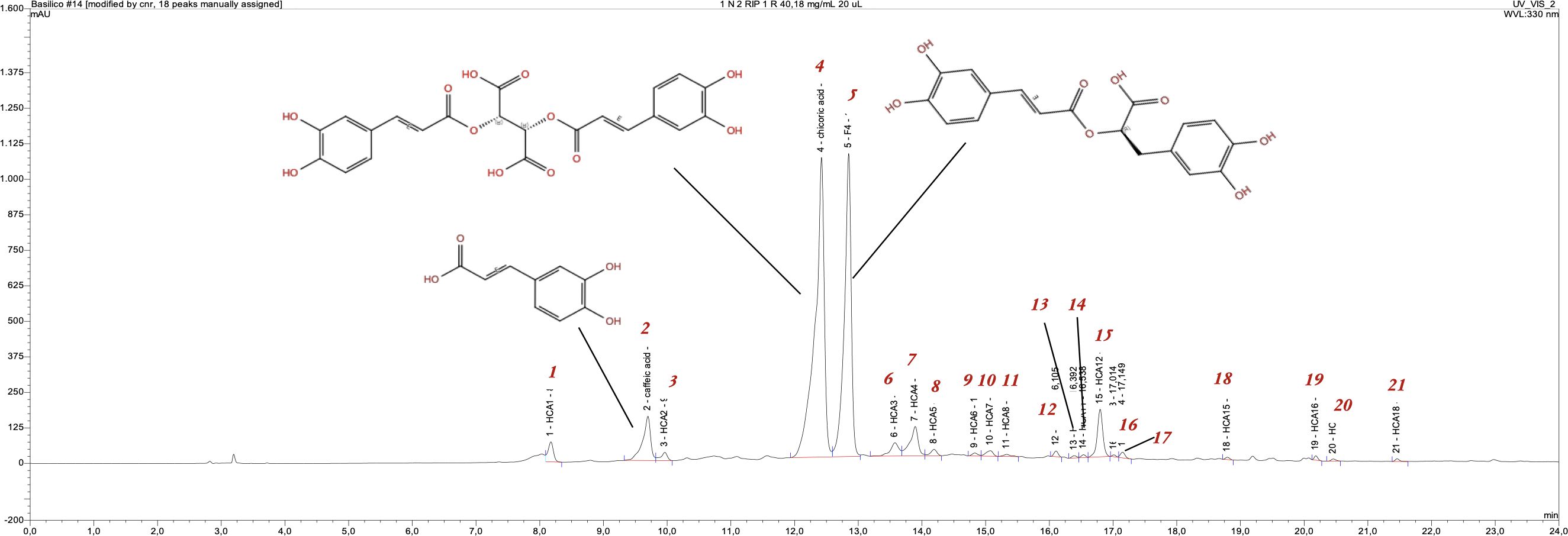The chromatographic profile (Figure 3) of the Italian basil leaves extract (growth at photoperiod 16:8) shows 21 chromatographic peaks, each of which has a characteristic UV spectrum at 330 nm associated with the molecular structure (chromophore) of hydroxycinnamic acids. The most abundant of these are peaks 1, 4 and 5, and chicoric acid (peak 4) is the most abundant of the three (44%) followed by rosmarinic acid (peak 5, 36%), while caffeic acid (peak 1), which is the precursor of both compounds, was present at 5%. The chromatographic profile of the hydroalcoholic extract of Rosie leaves (grown at a 6:4 photoperiod) showed that the main compound in this case was rosmarinic acid (peak 5), representing 35% of the extract (2.33 mg/g of Rosie dry leaves) followed by chicoric acid (peak 4) and caffeic acid (peak 1), which represented 17% and 9% of the extract, respectively (1.21 and 0.58 mg/g of Rosie basil dry leaves).