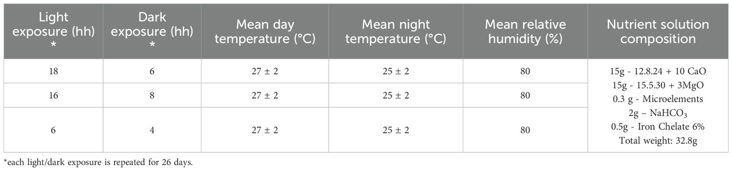 The selected basil genotypes were cultivated in a climate-controlled hydroponic growth cabinet (Horto4, Tomato+; see previous paragraph). Lighting was provided by the cabinet’s integrated full-spectrum LED modules (manufacturer: Tomato+, model Horto4, Borgosatollo, Italy; https://www.tomatopiu.com/serra-idroponica-4-piani-da-interni). The spectrum consisted of hyper red (635–666 nm, peak 660 nm; efficacy 3.17 μmol J−1; total output 37.28 μmol s−1), deep blue (439–461 nm, peak 451 nm; efficacy 2.39 μmol J−1; total output 29.16 μmol s−1), far red (720–740 nm, peak 730 nm; efficacy 3.14 μmol J−1; total output 12.54 μmol s−1), and true green (513–545 nm, peak 525 nm; efficacy 1.22 μmol J−1; total output 6.96 μmol s−1). The photosynthetic photon flux density (PPFD) at canopy height averaged ~163–171 μmol m−2 s−1 across shelves, as measured with a PAR quantum sensor. The corresponding daily light integral (DLI) values were estimated at 8.2, 9.9, and 10.9 mol m−2 d−1 for the 6:4, 16:8, and 18:6 photoperiods, respectively. These values are consistent with those reported in the literature for basil cultivation under comparable controlled-environment conditions (Frąszczak et al., 2011; D’Aquino et al., 2024). This system allows precise control over key environmental parameters such as photoperiod, temperature, humidity, and nutrient solution composition. The cabinet (64 × 60 × 200 cm) comprises four independently programmable cultivation shelves (except for the nutrient solution, which is supplied from a single shared 20 L tank). Each shelf accommodates 81 cultivation pods, allowing for a total of 324 plants to be grown simultaneously.