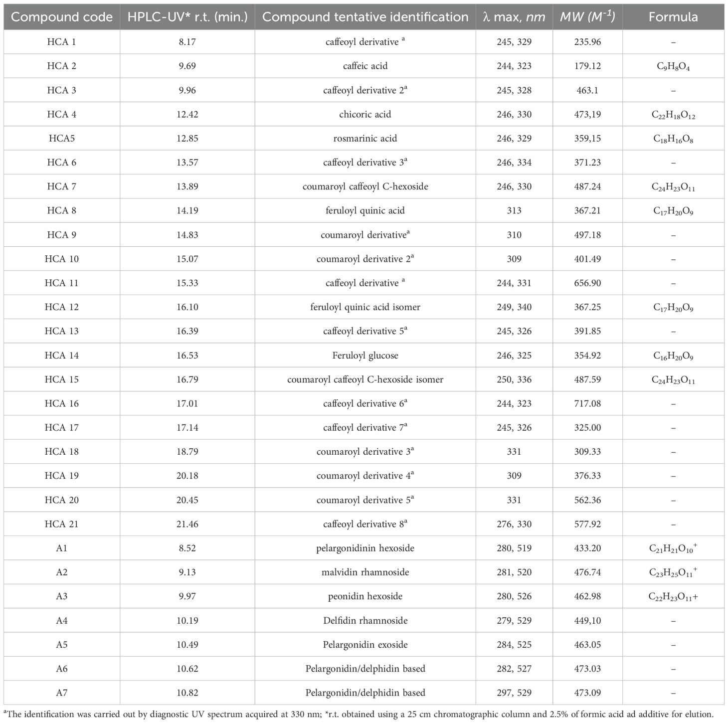 Twenty-nine metabolites (Table 3) were detected by HPLC/Uv-Vis-PDA. Twenty-one of them, marked with HCA1 to HCA21, belonged to the class of hydroxycinnamic acids, whereas eight metabolites (A1 to A8) belonged to the subclass of anthocyanins and were detected only in the Rosie genotype, belonging to the variety purpurascens (Phippen and Simon, 1998; Fernandes et al., 2019).