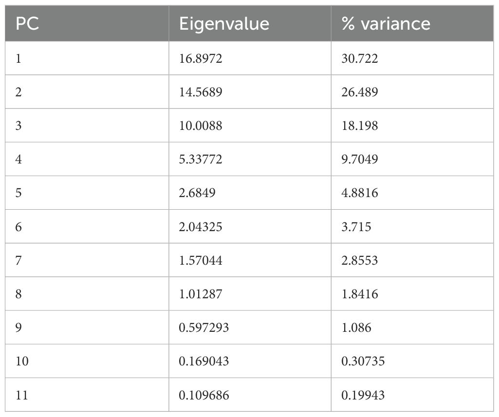 The PCA effectively discriminated the genotypes: Thai (clearly separated along PC1) and Rosie (well distinguished along PC2), whereas the Greek and Italian genotypes were more distinctly represented on PC3. Within genotypes, the first two PCs allowed distinction among photoperiodic treatments, with the sequence 6:4>16:8>18:6 generally corresponding to increasing values of PC1 and PC2.