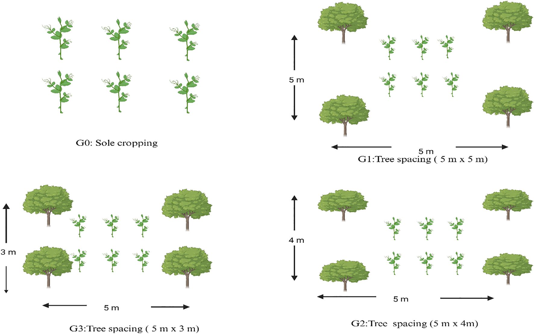 Figure 1. Representation of experimental layout showing different spatial arrangements of M. dubia-based agroforestry system intercropped with lentil varieties namely G0: Sole cropping, G1: Melia dubia at 5m × 5m, G2: Melia dubia at 5m × 4m and G3: Melia dubia at 5m × 3m.