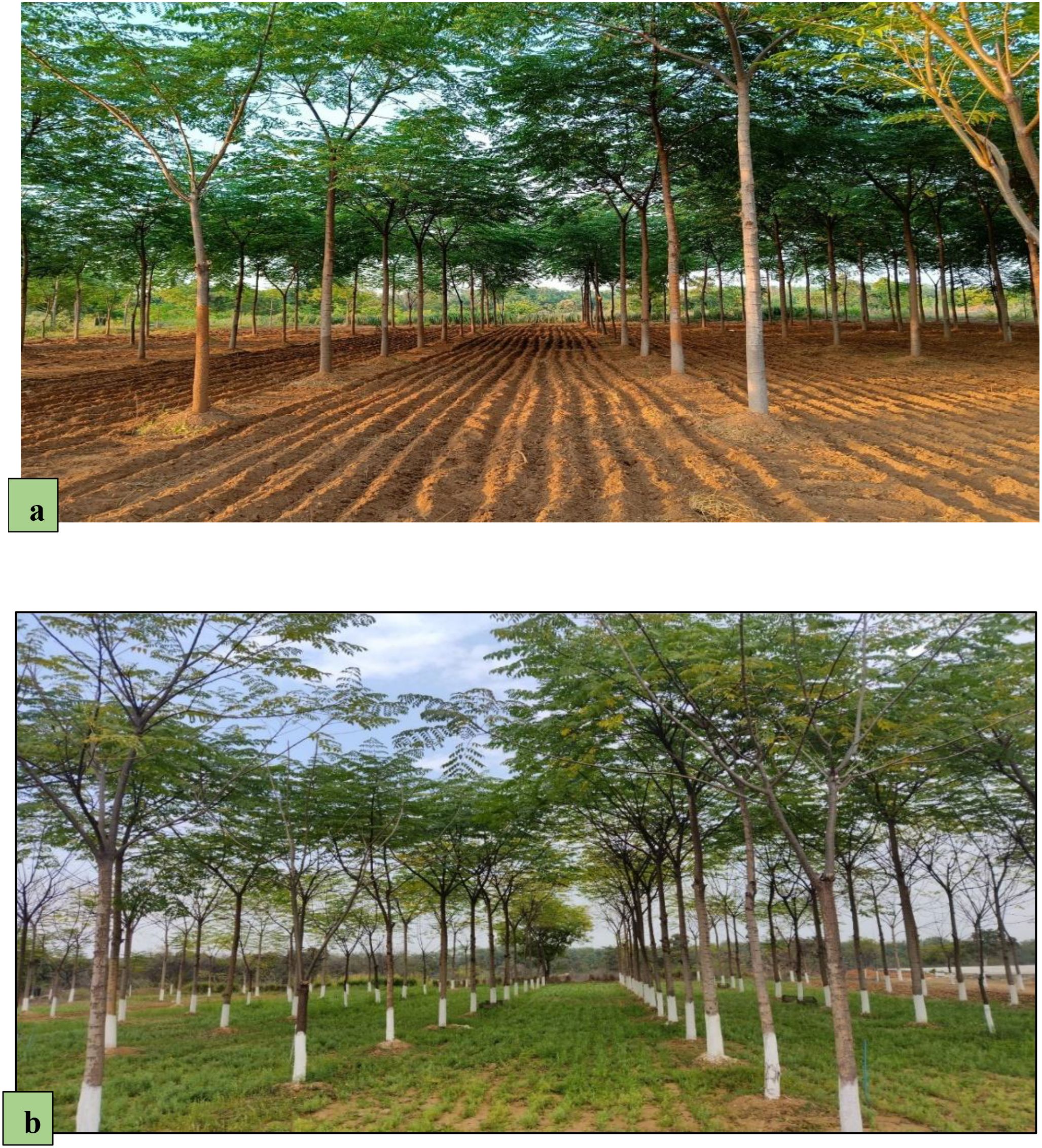 Figure 2. View of M. dubia plantation before sowing of lentil (a) and during the lentil crop growth period (b).