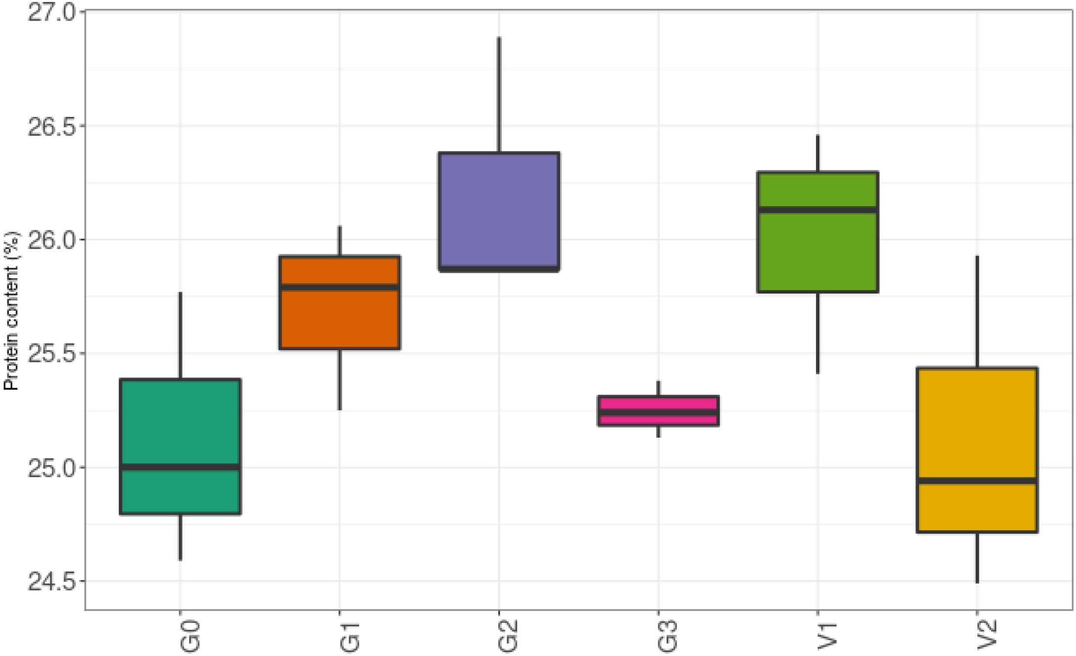 Figure 3. Effect of Melia dubia tree spacing on protein content (%) in seeds of lentil varieties under a Melia dubia-based agroforestry system. (Treatments: G0 = Sole lentil crop; G1 = Melia dubia at 5 m × 5 m; G2 = Melia dubia at 5 m × 4 m; G3 = Melia dubia at 5 m × 3 m; V1 = Lentil variety IPL 316; V2 = Lentil variety L 4727).