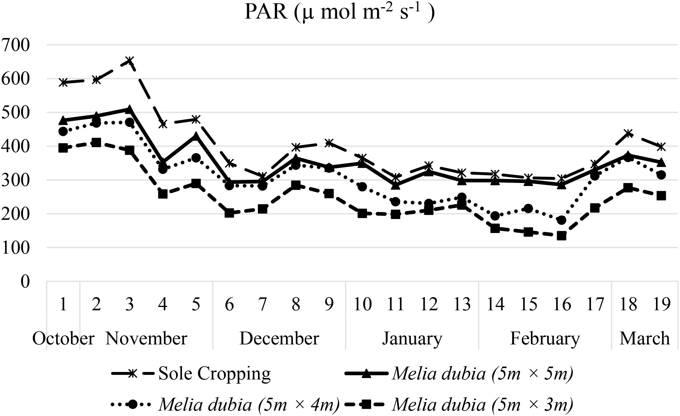 Figure 4. Effect of M. dubia tree spacings on PAR (Photosynthetically Active Radiation) during the crop growth period.