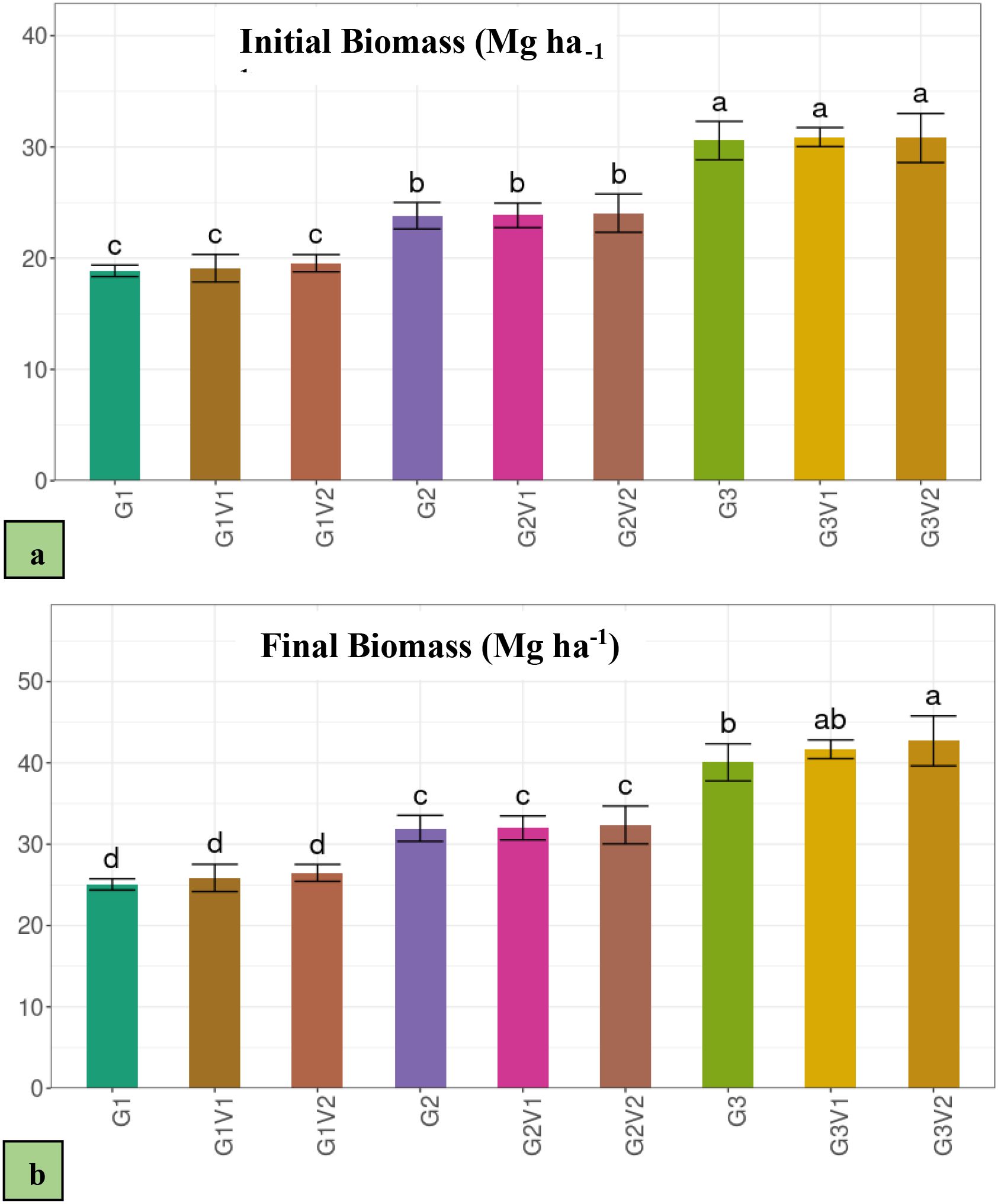 Figure 5. Total biomass [(a) initial biomass; (b) final biomass] of Melia dubia under under Lentil intercropping in agroforestry system (Treatments: G1V1 = Melia dubia at 5m × 5m + Lentil variety IPL 316, G1V2 = Melia dubia at 5m × 5m + Lentil variety L 4727, G1 = Melia dubia at 5m × 5m sole tree, G2V1 = Melia dubia at 5m × 4m + Lentil variety IPL 316, G2V2 = Melia dubia at 5m × 4m + Lentil variety L 4727, G2 = Melia dubia at 5m × 4m sole tree, G3V1 = Melia dubia at 5m × 3m + Lentil variety IPL 316, G3V2 = Melia dubia at 5m × 3m + Lentil variety L 4727, G3 = Melia dubia at 5m × 3m sole tree). Lowercase letters on error bar denote statistical significance (p ≤ 0.05) among treatment means. Treatment with same letter on error bar is statistically at par and vice versa.
