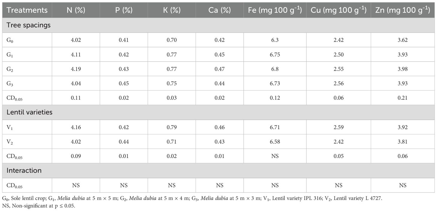 The data in Figure 4 showed clear variations in the photosynthetically active radiation (PAR) received by the crop across several agroforestry system treatments. The photosynthetically active radiation (PAR) values varied between 304.09 and 652.85 µ mol m-2 s-1 in the G0 (Lens culinaris sole cropping) and between 135.26 and 509.22 µ mol m-2 s-1 in the intercropped treatments (G1, G2, and G3) during the October 2023 to March 2024 crop growth period. A decrease in light availability resulting from the presence of M. dubia trees was consistently seen in the intercropped treatments, as evidenced by lower PAR values compared to the sole cropping. Among tree spacings, 5 m × 3 m (G3) exhibited the lowest PAR values, with values ranging from 135.26 to 410.68 µ mol m-2 s-1. The results emphasise the shading impact caused by M. dubia trees in the agroforestry system, leading to decreased light availability for the intercropped lentil crop. The diminishing pattern in PAR values as tree density increases highlights the need to take into account light availability during the establishment of agroforestry systems that include lentil or comparable pulse crops. Reduced PAR values under denser tree spacing not only limit photosynthesis but also alter the red:far-red phytochrome ratio, a key light quality signal regulating crop morphology and resource allocation under shaded environments (Smith, 2000). This change in light quality may explain variations in seed nutrient quality and growth responses of lentil under M. dubia spacing regimes. To achieve a satisfactory balance between tree benefits and agricultural yield in such environments, it is essential to optimize tree spacing and canopy management (Handiso et al., 2024). The shading caused by M. dubia leaves reduces the intensity of light, which in turn becomes a limiting factor in the decrease in yield of intercrops cultivated under M. dubia. Because of the shadowed conditions prevalent under block plantation, the data on PAR were higher in open conditions than under M. dubia. Gill et al. (2009) reported similar findings in the case of M. dubia, where there was a decrease in PAR under intercropping. Furthermore, several studies have examined the effects of various light conditions on crops in temperate agroforestry systems, including durum wheat and apple (Moretti et al., 2020). Peng et al. (2009) reported a significant reduction in photosynthetically active radiation (PAR) in a 4-year-old plantation of walnut and plum-based agroforestry spaced at 5 m × 3 m when intercropped with soybean maize. The effects of tree competition significantly reduced PAR in Neem-based agroforestry intercropped with black gram as compared to sole cropping (Pandey et al., 2010). Comparable results were also reported by Mukherjee and Sarkar (2016) in Acacia auriculiformis, Casuarina equisetifolia, Dalbergia sissoo, Glyricidia sepium, Albizia lebbek, Gmelina arborea, and Eucalyptus hybrid when intercropped with the tea crop in the eastern region of India.