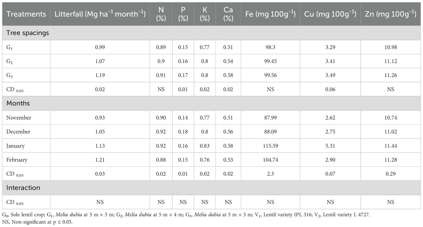 Leaf litter was collected from the trees from the onset of litterfall in November until the trees were entirely devoid of leaves in February across a three-year growth period. Three replications were employed for each treatment. Four metal litter traps measuring 1 m × 1 m × 10 cm were placed in each replication for each spacing. Leaf litterfall was obtained from these traps in paper bags during the leaf-shedding phase of M. dubia at biweekly intervals, and the quantities from two intervals were combined to get monthly litterfall values. The freshly weighed samples included a representative 50 g from each replication for subsequent analysis. The typical samples were subjected to oven drying at 70° C until a constant weight was achieved to determine the dry weight of litterfall (Mg ha-1). Subsequently, the dried samples were crushed with an electric grinder equipped with stainless steel blades and sieved through a 2 mm mesh. The concentration of several nutrients was assessed according to the standard protocol on a monthly basis. The identical procedures employed for estimating nutrient contents in litterfall were also used for nutritional analysis in lentil seeds. The data were statistically analyzed using a split-plot design, with tree spacings as the main plot and months as the subplots.