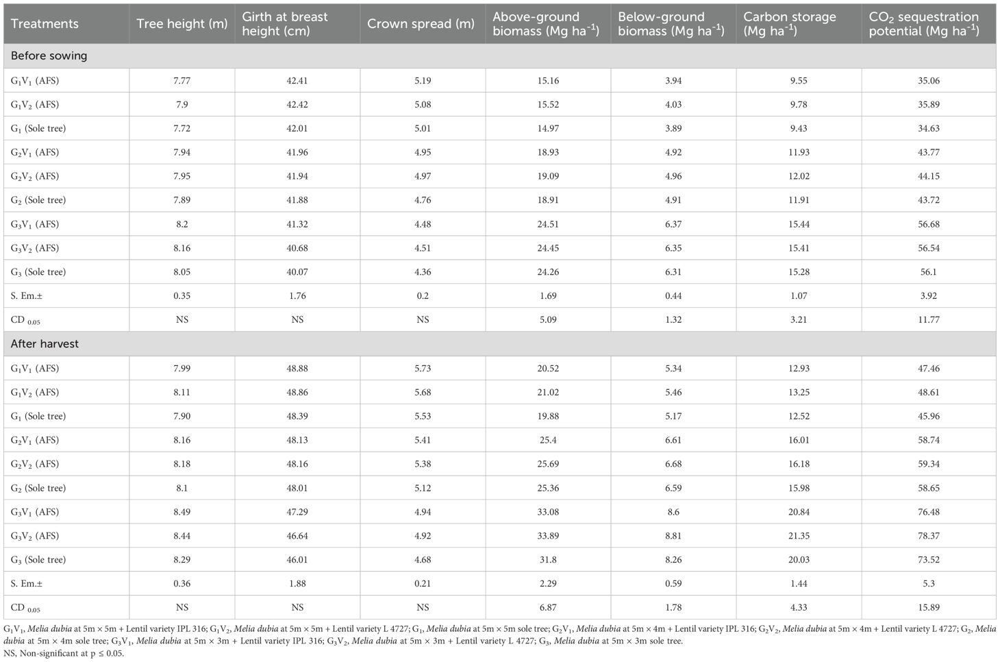Table 3. Growth, biomass, and carbon sequestration attributes of M. dubia under lentil intercropping in an agroforestry system.