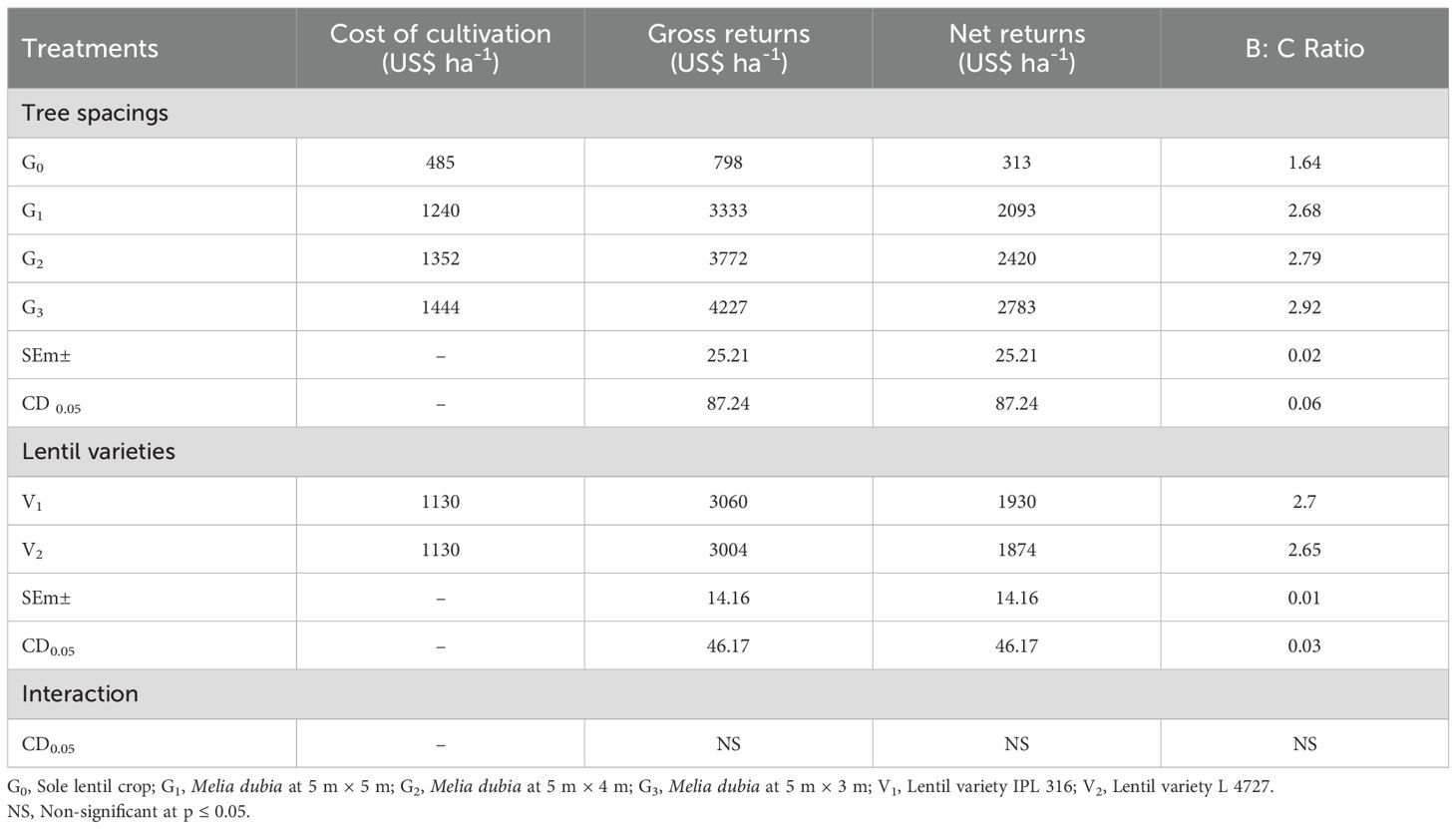 The costs related to the cultivation of lentil and M. dubia trees were evaluated based on the net cultivated area per hectare. The labour and mechanical power necessary for operations, including ploughing, harrowing, weeding, and harvesting, together with the costs associated with seeds and farmyard manure, were computed on a per-hectare basis utilizing the prevailing rates at the experimental farm. Returns were calculated on a per-hectare basis, considering the market selling prices of the cultivated crops. The total returns from M. dubia were assessed by evaluating the above-ground volume. Net returns were calculated by deducting total costs from gross returns and reported in US dollars. Net returns were calculated using formula of Bhatia et al. (2024).