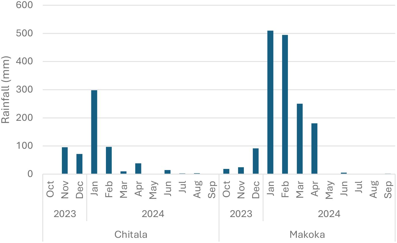 The field experiments were conducted in three contrasting agroecological zones in the central (Lilongwe and Salima) and southern (Zomba) regions of Malawi. The target sites, namely Chitedze research station in Lilongwe, Chitala research station in Salima and Makoka research station in Zomba represent three contrasting agro-ecological zones (AEZ) as defined in Malawi (Saka et al., 2006): Chitedze represents the mid-elevation upland plateau at 760–1300 masl, and AEZ 3 the highlands at > 1300 masl. Chitala represents lake shore, middle and upper Shire at an elevation of 200–760 m above sea level (masl), while Makoka represents representing low, mid, and high agroecological zones with elevation ranging from 600 to 1400 meters above sea level. At Chitedze research station, the trial was established at longitude 13°59′S, 33°38′E, altitude of 1153m.a.s.l. with an elevation ranging from 760- to 650 meters above sea level. At Chitala, the trial was established at 13°40’S and longitude of 34°15’E, at an elevation ranging from 525 to 650 meters above sea level. In Makoka, the trial was conducted at latitudes 15°50’ - 16°03’ South and longitudes 35°30’ - 35°47’ E at an elevation ranging from 700 to 1400 meters above sea level. In Malawi the mid altitude agroecology lies between 600–1415 meters above sea level (m.a.s.l) with mean annual rainfall of 600–1420 mm. During the cropping season, the effective rainfall exposure period and amount received differ significantly across locations as shown in Figure 1.
