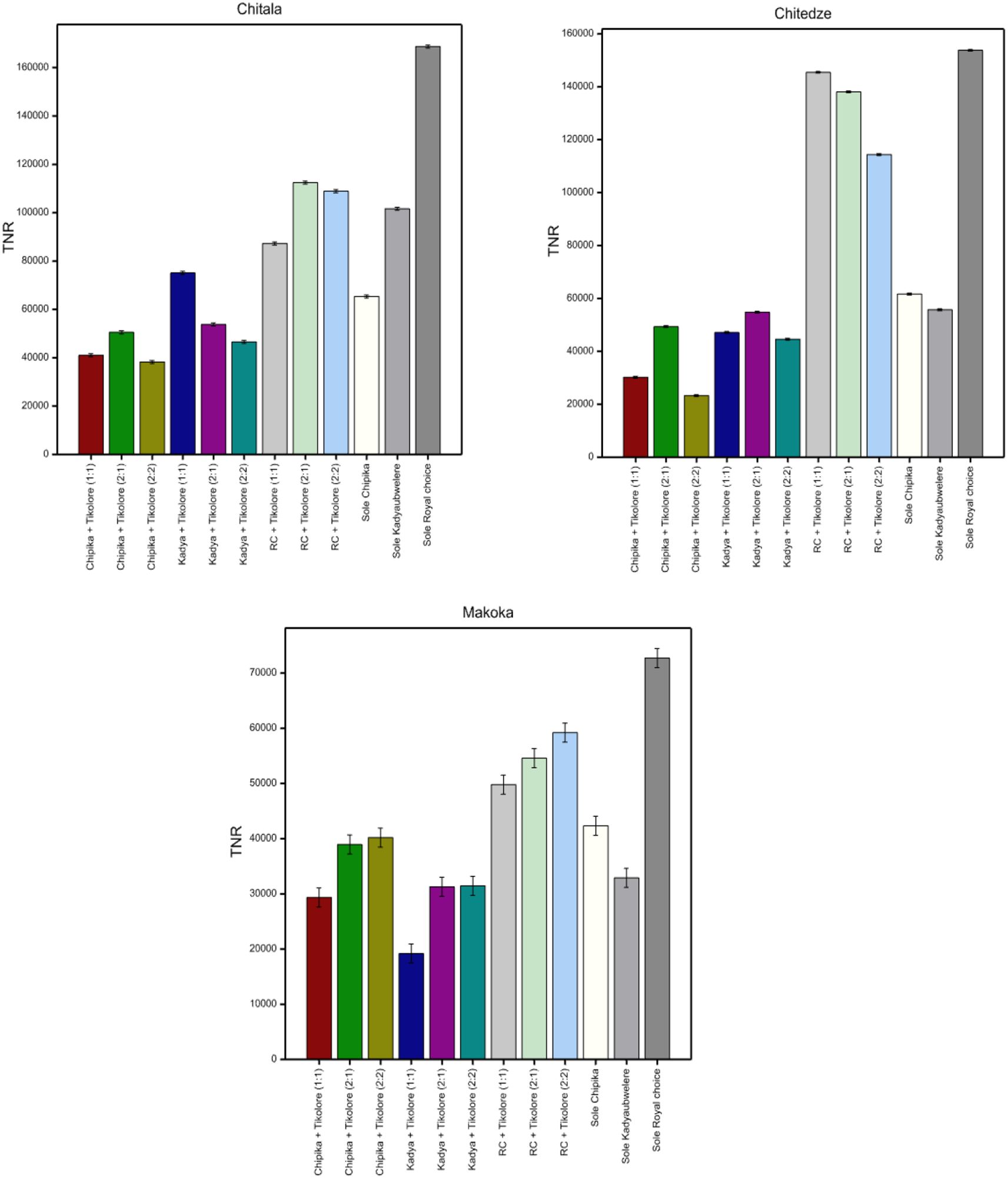 Figure 2 present the total number of roots of sweet potato across the three locations. The results show significant variations between cropping systems, varieties and locations. The number of roots was observed to be generally higher in Royal choice sole cropping than in the intercrops. It varies from 168741ha-1 for Royal Choice sole cropping in Chitala to 19200ha-1 for Kadyaubwelere - Tikolore (1:1) in Makoka. Generally, the results show that royal choice sole cropping consistently produced the highest total root number which were significantly higher than those produced by intercropping systems across the three locations. Among the varieties, the results further reveal that the total number of roots were significantly higher in royal choice (medium vine length) than in Kadyaubwelere (long vine length) and Chipika (Compact/short vine length) varieties in all the locations. Comparison among the intercrops, all the Royal Choice intercrops gave the highest total number of roots across the three locations. On the other hand, Kadyaubwelere - Tikolore (1:1) recorded the lowest total number of roots of 19200ha-1 at Makoka. However, the total number of roots was relatively higher in Kadyaubwelere intercrops than in Chipika in Chitedze and Chitala stations. Regardless of the intercropping systems, it was observed that the total number of roots were generally low at Makoka research station as compared to the other two research stations.