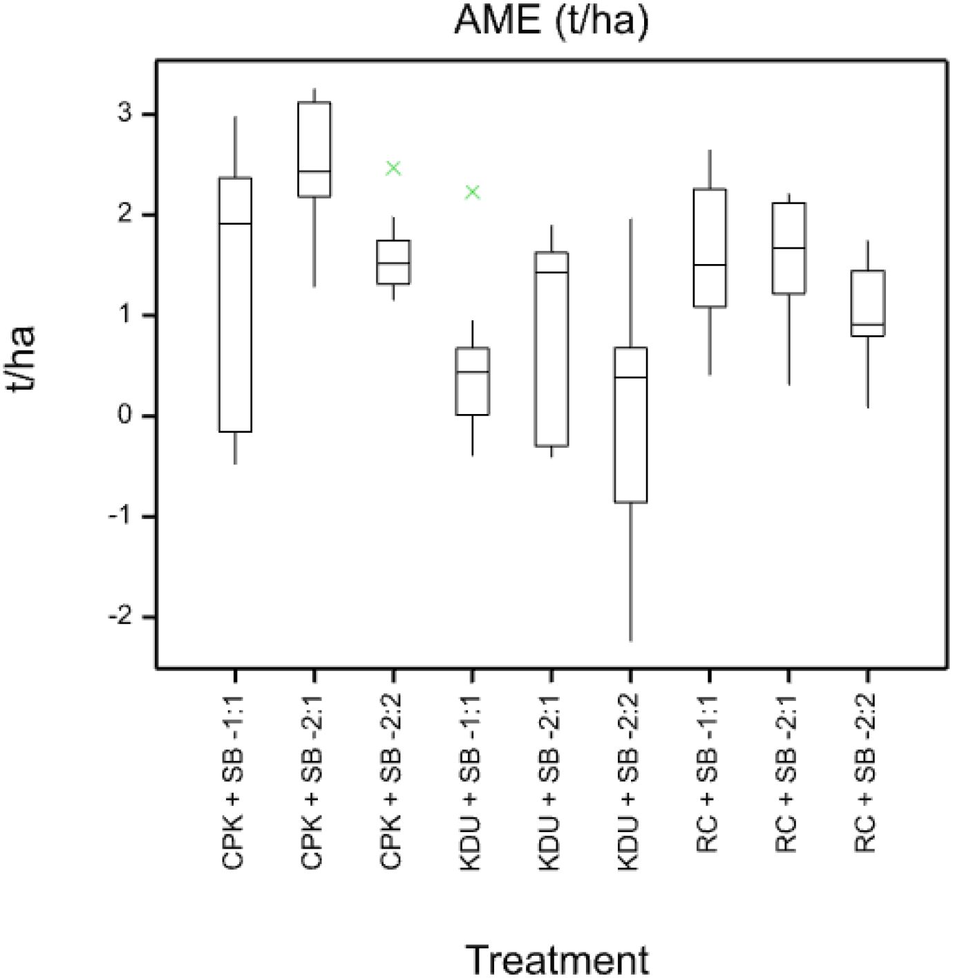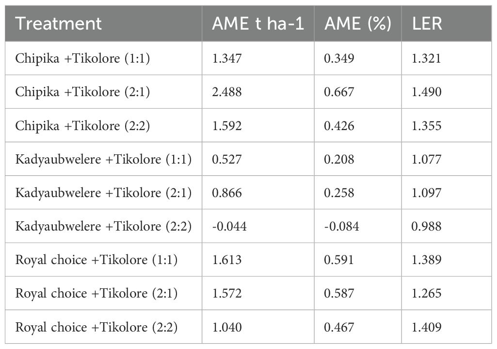 The results of AME in Table 11 shows that sweetpotato – soybean intercrops are more productive than sole cropping as they recorded significant yield increase above the sole cropping except in Kadyaubwelere - Tikolore (2:2) that recorded negative AME (-0.084). Comparing the intercrops, Chipika - Tikolore (2:1) had the highest yield increase of 2.488tha−1, above the sole cropping with the LER of 1.490(Table 11). Also, the Royal choice -Tikolore (1:1) was on average 59% more productive than sole cropping and had a yield increase of 1.613tha− 1 than sole cropping (Figures 3–5). However, Kadyaubwelere - Tikolore (2:2) had a negative yield advantage of -0.044 tha−1 and contributed -0.084%) to the total productivity (Figures 3–5).