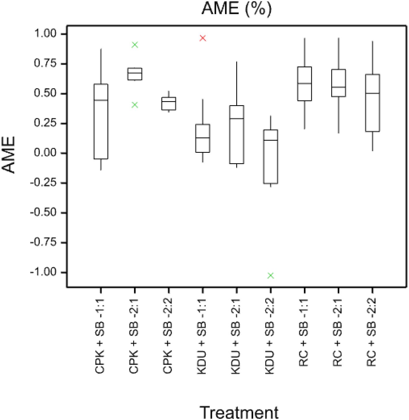 The Absolute Mixture Effect (AME) in intercropping is a way to quantify how the combined yield of crops in an intercrop system differs from the average yield of the same crops grown separately in monocultures. It essentially measures the total benefit or detriment of growing crops together, compared to their individual yields.