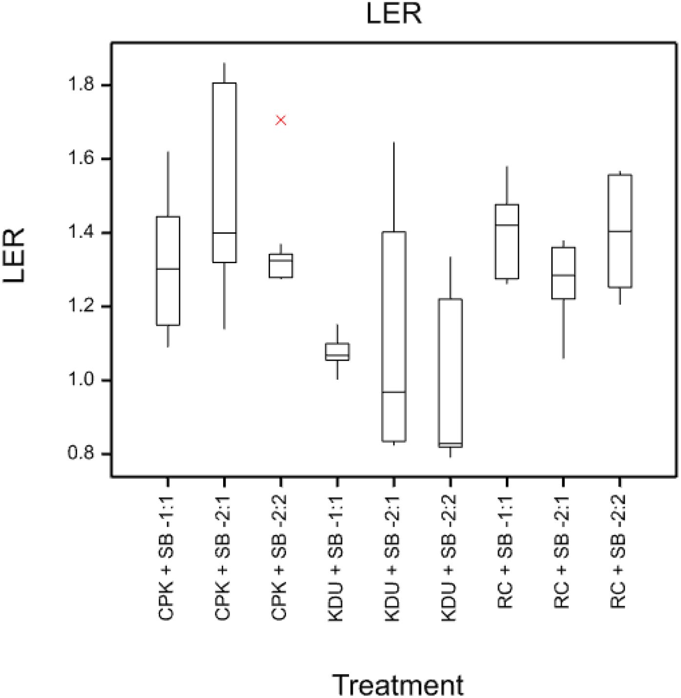 In this case, Y1 and Y2 are the yields of intercrops of sweetpotato and soybean; M1 and M2 are the yields of monocrops of sweetpotato and soybean. An LER > 1.0 indicates an advantage in intercropping, while an LER< 1.0 indicates a disadvantage of intercropping. A LER >1, intercropping is more efficient than monocropping. LER of 1.0 means that the land area needed to grow a component crop in an intercrop is the same as when growing a component crop in a pure stand.