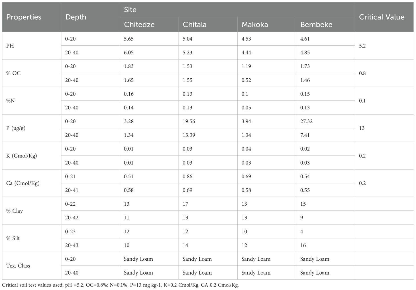 Soil analysis results show that soils in all stations are acidic ranging from slightly to strongly acidic and soils were mostly low in N, P and K content (Table 1) as regards to the critical values and ratings for Malawi soils (Snapp et al., 1998). Soils pH below 5.2 are considered acidic and SOC, N, P and K levels below 0.8%, 0.1%, 13 mgkg-1 and 0.2 Cmol/Kg are considered low for proper growth of plants. At Chitedze soils were moderately acidic with pH level for top (5.65) and subsoil (6.05) above the critical value, P (3.28 ug/g) and K (0.01 Cmol/Kg) were also low except OC, N, and Ca levels were all above the critical levels with soils being classified sandy loamy. At Chitala, soils were also acidic, pH level for topsoil (5.04) below critical value and K was also low for both top and subsoil, 0.03 Cmol/kg below critical value while the rest of other measured properties were above critical values with the soil texture classified sand loamy (Table 1). Soils at Makoka were strongly acidic, with pH of 4.53 for topsoil and 4.44 for subsoil, topsoil OC (1.19%) was above the critical value and topsoil N (0.1%) was just within adequate range while rest of the properties were below critical values with soils classified as sandy loam.