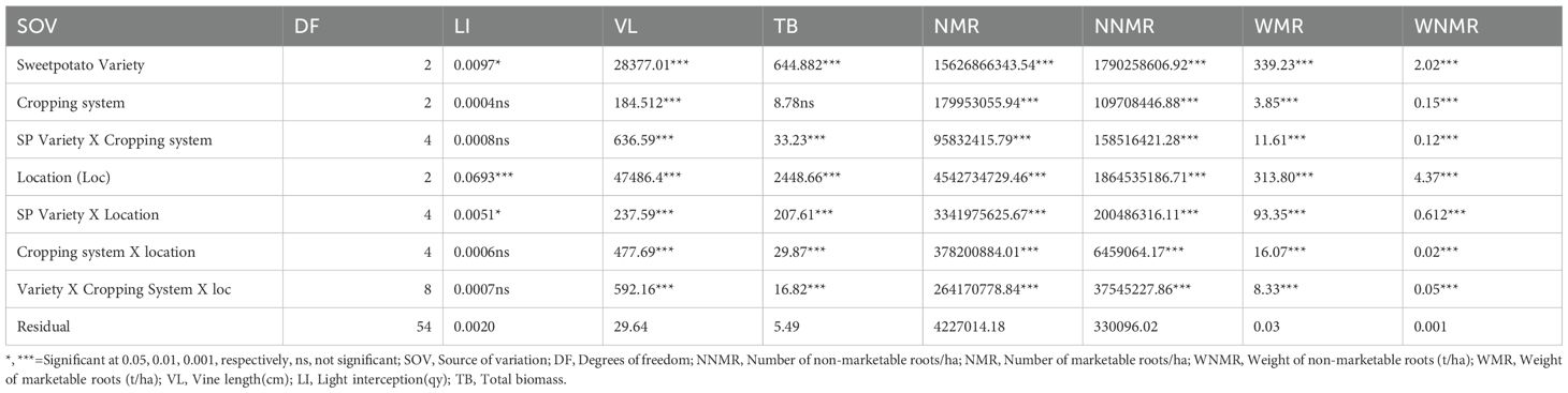 The combined analysis of variance across locations showed that sweetpotato varieties, cropping systems, locations and their interactions significantly (P< 0.05) influenced sweetpotato vine length, total biomass, number of marketable roots/ha, number of non- marketable roots/ha, weight of marketable roots (kg/ha) and weight of non-marketable roots(t/ha) (Table 2). The results also reveal that the performance of sweetpotato varieties differed significantly (P< 0.001) for all the traits measured except at P< 0.05 in the amount of light intercepted. Overall, sweetpotato variety x location x cropping system interactions were highly significant in explaining the variations observed in all the parameters measured except for the quantity of light intercepted that showed non-significant difference (Table 2).