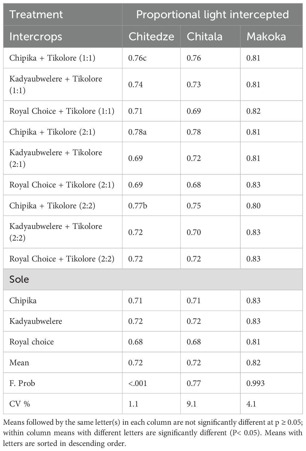 Table 3. Proportional light intercepted of sweetpotato-soybean intercrops across three locations during the 2023/2024 cropping season.