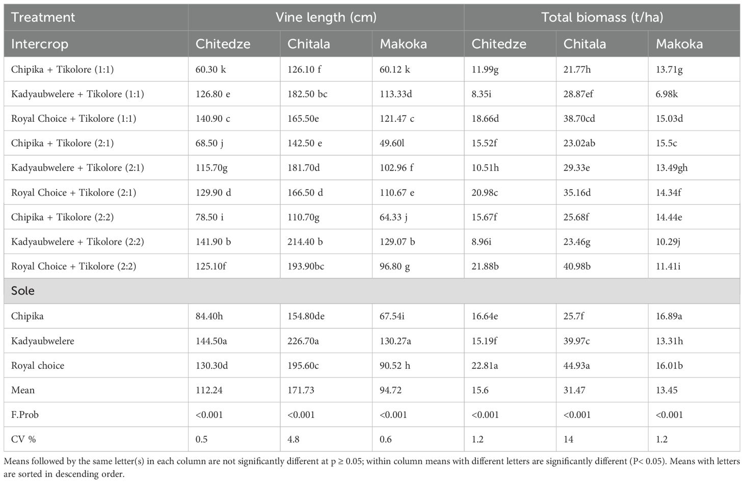 3.1.2 Sweetpotato vine length(cm) and total biomass(t/ha) across the three locations