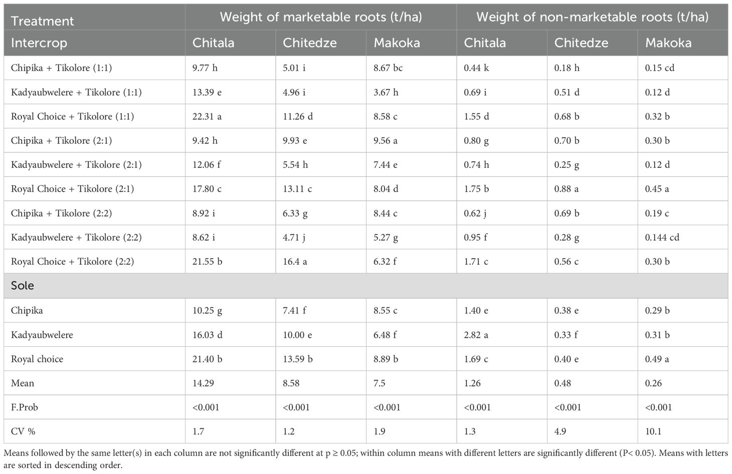Table 5. Weight of marketable roots (t/ha) and weight of non-marketable roots (t/ha) of sweet potato intercropped with soybean across locations during the 2023/2024 cropping season.
