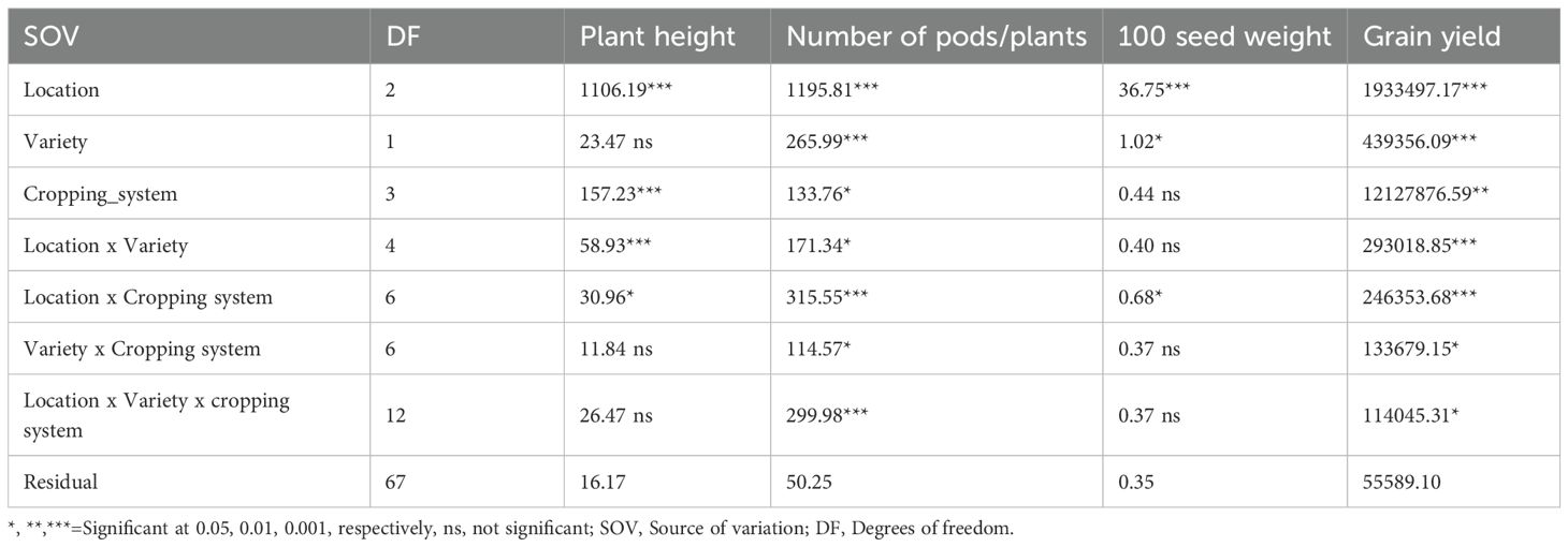 Table 6. Variation due to location, variety, spatial arrangement and their interactive effects on plant height, number of pods/plants, 100 seed weight and grain weight.
