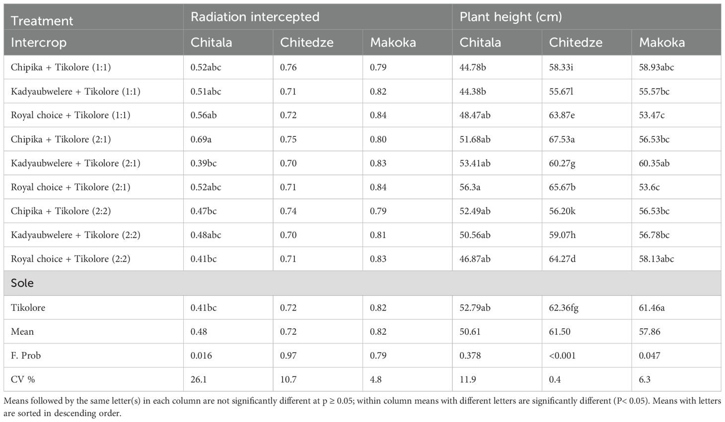 3.3.2 Proportional radiation intercepted and plant height (cm) of soybean intercropped with sweet potato across