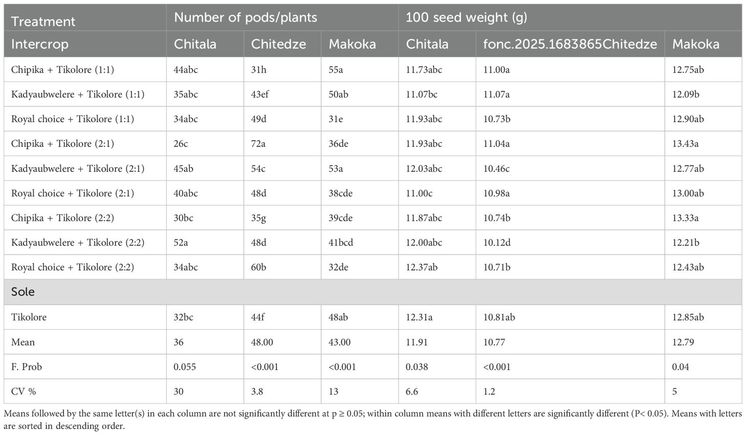 Table 8. Number of pods/plant and 100 seed weight (g) of soybean intercropped with sweet potato across locations during the 2023/2024 growing season.