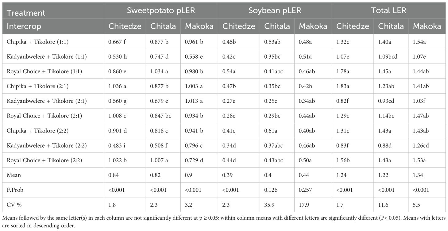 In this study, the effects of sweetpotato varieties were assessed under different intercropping arrangements across three contrasting environments. Three varieties that vary in growth habits and vine length were used to provide variability in terms of the variety’s effect under intercropping. These traits and others were reported by Demie et al., 2022 as being potentially critical in determining species interactions in intercropping systems. Total land equivalent ratio (LER) and absolute mixture effect (AME) were used to evaluate the potential advantages of intercropping over sole cropping (Bedoussac and Justes, 2011; Yu et al., 2015). The results show that locations, intercropping systems, and variety architecture significantly influenced the yields, and other traits of sweetpotato and soybean, indicating high level of variabilities within the varieties, cropping systems and study sites that represent variation in rainfall, temperature, solar radiation, humidity. These results corroborate the findings of Pankou et al., (2022); Moutier et al. (2022); Naudin et al. (2010) who reported that growing seasons, treatments and their interactions significantly affected most of the characteristics that were measured when they evaluated wheat–pea intercropping systems for high productivity. Munda et al. (2019) also reported similar results when they evaluated the effects of intercropping and phosphorous application on the growth and yield of sweetpotato, groundnut and soybean in Mozambique. Similarly, it was observed that all the sweetpotato varieties produced significantly higher vine length, total biomass and root numbers under the sole cropping system than when they were intercropped with soybean. The vine lengths were longer in sole cropping than in intercropping. These findings also align with the results of many other studies that shown that sweetpotato sole cropping was exposed to maximum sunlight throughout the growth period which enhanced their ability to intercept maximum light for photosynthesis and biomass accumulation as compared to intercropping systems where there was a degree of interplant competition for sunlight, nutrients and water due to the shading effect of component crops which reduced the ability of intercrops to intercept light and other resources required for vegetative growth Pankou et al. (2022), Egbe and Osang (2015). Belehu (2003) had reported that solar radiation and soil nutrients had significant influence in the formation of root primordial in sweet potato. Egbe and Osang (2015) also observed higher folder weight in sole cropping than intercrop when they evaluated intercrop advantage of sweetpotato and soybean in Makurdi, Nigeria. The result also agrees with the findings of Egbe and Idoko (2012), Idoko et al. (2018) who reported high number of marketable roots in sole cropping than intercropping when they evaluated the effect of intercropping orange fleshed sweetpotato varieties with maize in Makurdi. On the contrary, the yields of marketable roots were significantly higher in intercropping than the sole cropping. These results can be attributed to more efficient use of light, water, nutrients, reduction of pests and diseases and better weed control in intercrops than in sole cropping as reported by Stomph et al., 2020; and Pankou et al., 2021; Kammounda et al., 2021. There was a significant interaction effect of the three varieties on the relative performance of the intercrops. Sweetpotato varieties react differently under different cropping systems as yield performance differed from variety to variety, indicating that sweetpotato varieties response differently to different cropping arrangements. Root yield performance was significantly different among varieties as evidenced in the intercrops that involved erect and short vine varieties (Royalchoice and Chipika) which consistently produced significantly higher weights of marketable roots compared to the long vine variety (Kadyaubwelere) across the three locations. The higher root yield recorded by the erect and short vines sweetpotato varieties could be explained by the fact that the erect variety did not spread much and as such was not affected by competition for light as compared to the intercrops of long and spreading variety. The observed variations in the performance of different varieties could be further attributed to the differential response of varieties in the use of natural resources and seasonal variation in weather conditions (Hauggaard-Nielsen and Jensen, 2001). Demie et al., 2022 also reported a trend of shorter cereal cultivars being associated with higher intercropping performance, due to less competitive ability of shorter cereals cultivars that resulted to higher productivity in intercropping systems. These results also align with the earlier findings of Stomph et al., 2020 who reported that differences in plant architecture could affect the interspecific competition and efficient exploration of both the above and below resources. The result implies that the productivity of an intercrop system largely depends on the variety used as well as the environment. This finding reinforces the need to consider variety-specific characteristics, especially vine length and growth habits of sweetpotato during the selection of varieties for intercropping (Ajal et al., 2021; Santalla et al., 2001). Additionally, different growing environments had a highly significant effect on the average performance of different intercrops as they reacted differently under multiple environments. For example, sweetpotato root yields at Chitala were significantly higher than in Makoka and Chitedze research stations. The reason for yield variability across the three growing environments confirmed the influence of weather variations such as the amount of rainfall received, soil water exchange, solar radiation and contrasting soil conditions as reported by several authors such as Paul et al., 2023; Moutier et al., 2022; Naudin 
