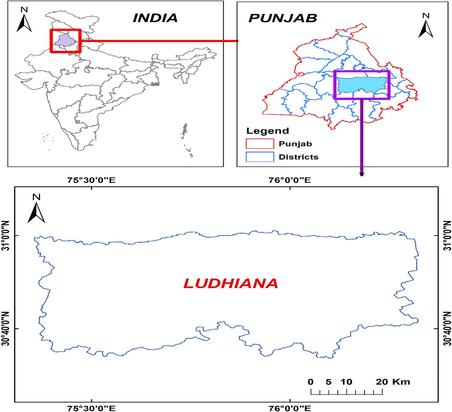 The present research was conducted at the research farm of the School of Organic Farming, PAU, Ludhiana, Punjab, India, located at 30°56′ N, 75°52′ E, 247 m.a.s.l. The map of the experimental area is depicted in Figure 1. The research study was undertaken for six consecutive years (from 2017–2018 to 2022–2023) under the “All India Coordinated Research Project on Integrated Farming Systems.” The experimental site is located in the central plain zone of Punjab, within India’s trans-Gangetic region. The region’s climate is semi-arid and subtropical with distinct seasons. It is dry and hot from April to June and changes to a humid and warm monsoon weather from July to September. October and November bring mild early winters, followed by colder winter months from December to February. Moreover, the annual rainfall averages 755 mm, with approximately 70% of the total occurring from July to September due to the southwest monsoon. The soil in the experimental site was characterized as sandy loam, falling under the Typic Ustochrept order of the Samana series (Piper, 1966). Initially, the soil had a normal pH (7.15) and electrical conductivity (0.270 dS/m), as measured using a pH meter in a 1:2 soil-to-water suspension. Electrical conductivity was recorded from the supernatant of the same suspension using a Systronics direct reading conductivity meter (Jackson, 1973). The OC (0.39%) was determined using Walkley and Black’s rapid titration method (Walkley and Black, 1934). The available nitrogen, measured using the modified alkaline permanganate method (Subbiah and Asija, 1956), was categorized as low (204.89 kg/ha). The available phosphorus was quantified using Olsen’s method (Olsen et al., 1954), with color development in the extract using ascorbic acid. The absorbance measured at 760 nm on a spectrophotometer (Olsen et al., 1954) fell under the medium level (20.16 kg/ha). The available potassium (145.28 kg/ha) was extracted with a neutral normal ammonium acetate solution (Piper, 1966) and measured via flame photometry. The diethylenetriaminepentaacetic acid (DTPA)-extractable micronutrients were analyzed from a 1:2 soil-to-extractant ratio using a DTPA-TEA (triethanolamine) buffer (0.005 M DTPA + 0.001 M CaCl2 + 0.1 M TEA, pH 7.3) as described by Lindsay and Norvell (1978). The micronutrient concentrations were determined using atomic absorption spectrophotometry (AAS), and the concentrations of zinc, iron, copper, and manganese were 2.40, 18.97, 2.05, and 8.88 mg/kg, respectively. Bulk density (1.46 g/cm3) was assessed with undisturbed soil cores placed in a 100-cm3 steel cylinder (Blake and Hartge, 1986), while the water holding capacity (WHC) (32.67%) was measured using the method proposed by Richard (1954) (Keen’s box method).