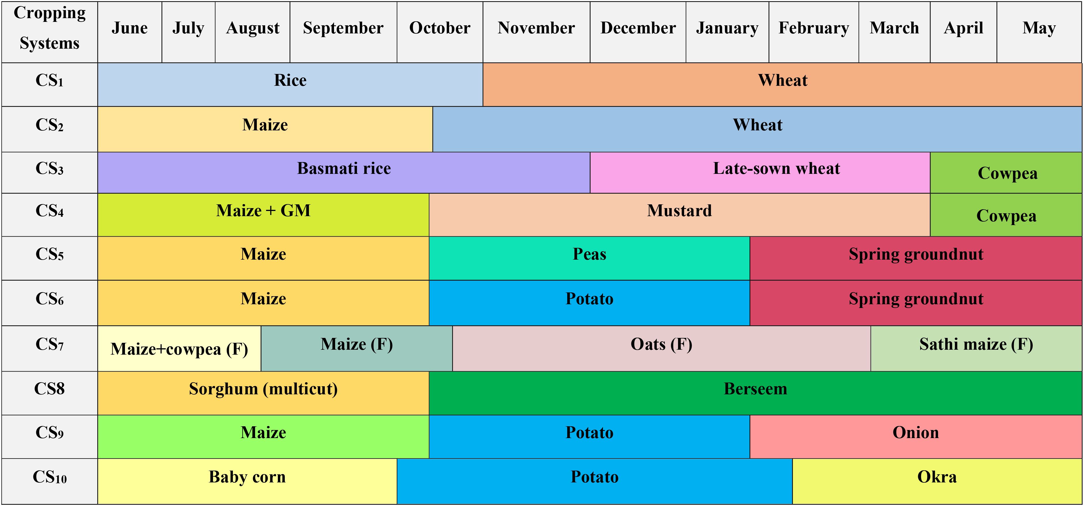 The field study was conducted from 2017–2018 to 2022–2023 with 10 different cropping systems as treatments: rice–wheat (CS1), maize (Zea mays)–wheat (CS2), basmati rice–late-sown wheat–cowpea (Vigna unguiculata) (CS3), maize + (green manure)–mustard (Brassica juncea)–cowpea (CS4), maize–potato (Solanum tuberosum)–spring groundnut (Arachis hypogaea) (CS5), maize–peas (Pisum sativum)–spring groundnut (CS6), maize + cowpea (fodder)–maize (fodder)–oats (Avena sativa) (fodder)–Sathi maize (fodder) (CS7), Sorghum multicut (Sorghum bicolor)–berseem (Trifolium alexandrium) (CS8), maize–potato–onion (Allium cepa) (CS9), and baby corn–potato–okra (CS10). The experiment was conducted using a randomized complete block design with four replications in a plot size of 10 m × 9 m. The crop calendar for the 10 cropping systems is depicted in Figure 2.