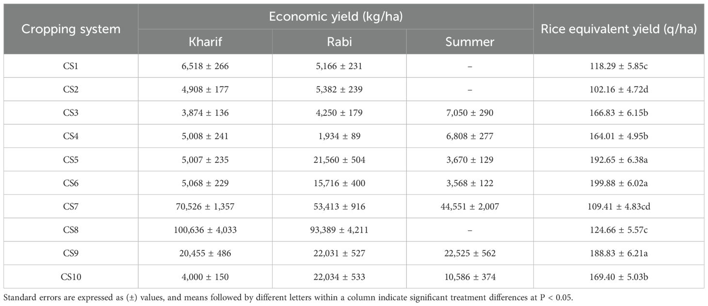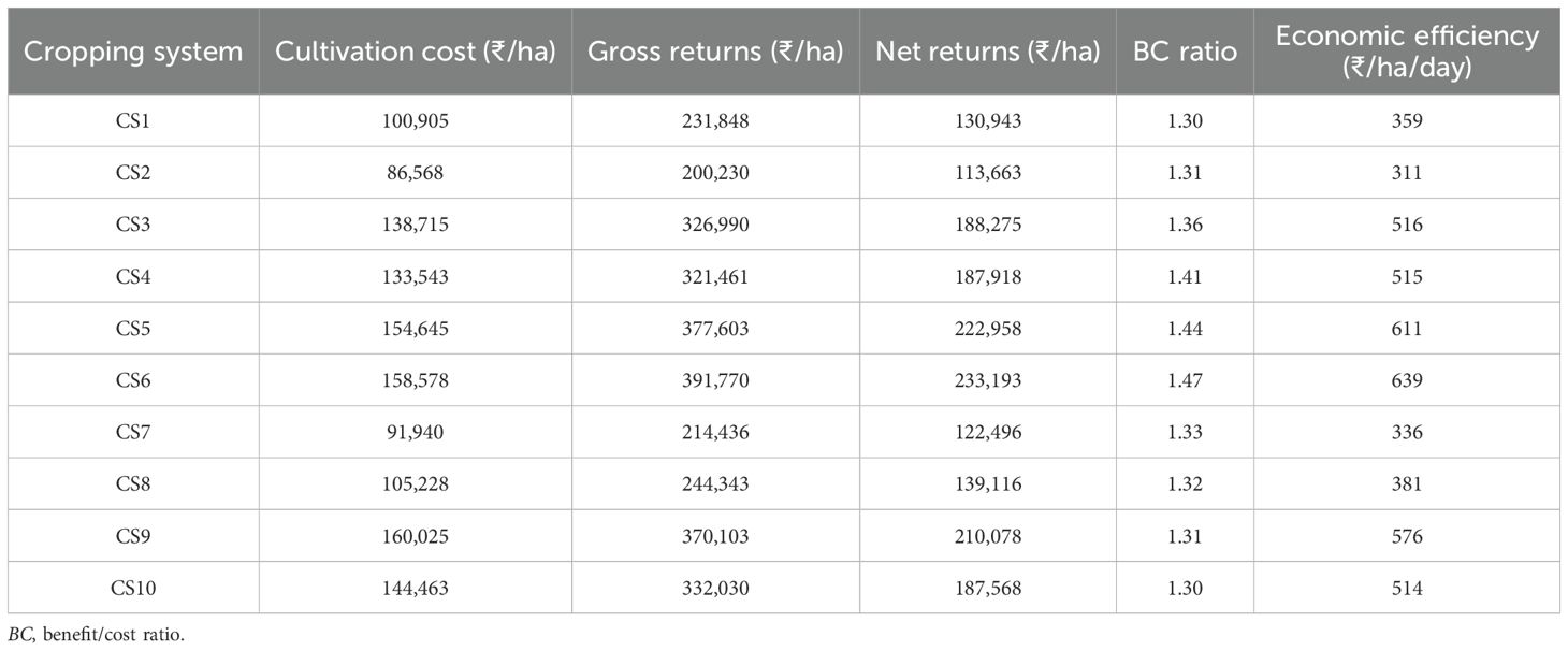 After 6 years of experimentation, the soil properties were analyzed in 2023 for all cropping systems. Samples from treatment plots at depths of 0–15 cm were mixed, shade-dried, sieved (2 mm), and assessed for the physical and chemical properties of the soil using the standard procedures mentioned above. Stored at 4° C, samples were used to quantify the microbial populations as colony-forming units (CFU) through triplicate plate counts on specific media (nutrient agar for bacteria, glucose yeast extract for fungi, Kenknight and Munaires for actinomycetes, and Jensen’s medium for diazotrophs). The media were sterilized at 15 psi and 121° C for 20 min. For homogeneity, 10 g of fresh soil was agitated in sterile distilled water, with serial dilutions to a factor of 10 (Subba Rao, 1986). The enzyme activity, i.e., dehydrogenase, alkaline phosphatase, and urease, was assessed following the methods of Tabatabai (1982); Tabatabai and Bremner (1969), and Douglas and Bremner (1970), respectively. The MBC and MBN were calculated following the methods proposed by Jenkinson and Ladd (1981) and Jenkinson (1988), respectively. The harvested produce from each cropping system was weighted for the calculation of economic yield (in kilograms per hectare) and rice equivalent yield (REY; in quintals per hectare). REY was derived by converting the economic yield with crop-specific market prices, relative to rice. The cultivation cost (in rupees per hectare) was calculated as the sum of the input costs (i.e., seeds, fertilizers, plant protection, and irrigation) and the operational costs (e.g., hired and family labor, land preparation, sowing, weeding, and harvesting). Gross returns (in rupees per hectare) were calculated by multiplying the economic yield by market price with the net returns (in rupees per hectare) derived by subtracting the cultivation costs. The benefit/cost (BC) ratio was obtained by taking the ratio of the net returns to the cultivation costs. Economic efficiency (in rupees per hectare per day) was calculated by dividing the net returns by 365.