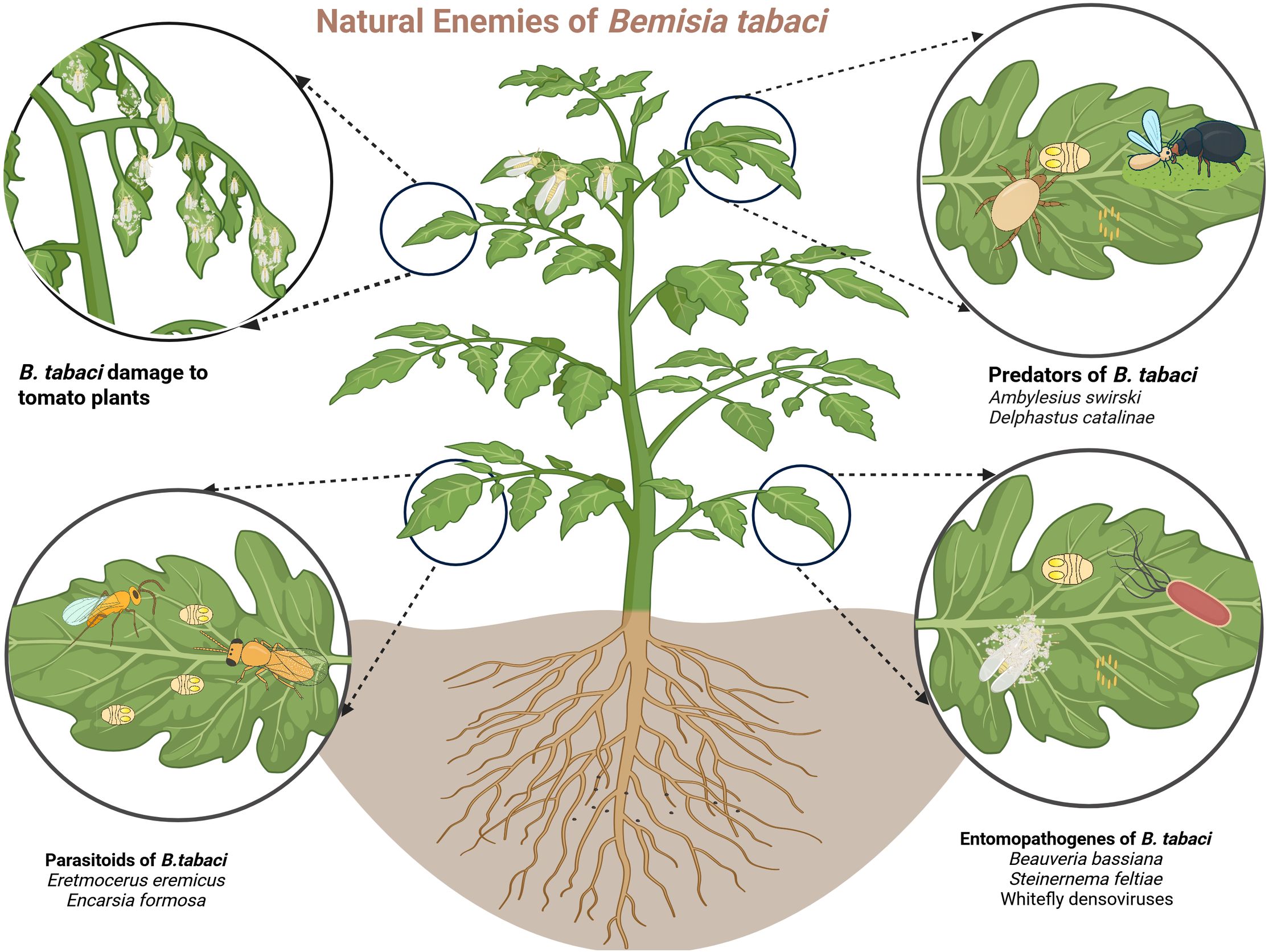 Figure 1. Illustration of a tomato plant infested by the whitefly Bemisia tabaci, with insets depicting its principal natural enemies. The top left inset shows characteristic plant damage caused by the pest; the bottom left illustrates parasitoids (e.g., Eretmocerus eremicus); the top right presents predators (e.g., Amblyseius swirskii); and the bottom right depicts entomopathogens (e.g., Beauveria bassiana) (image created in Biorender)..