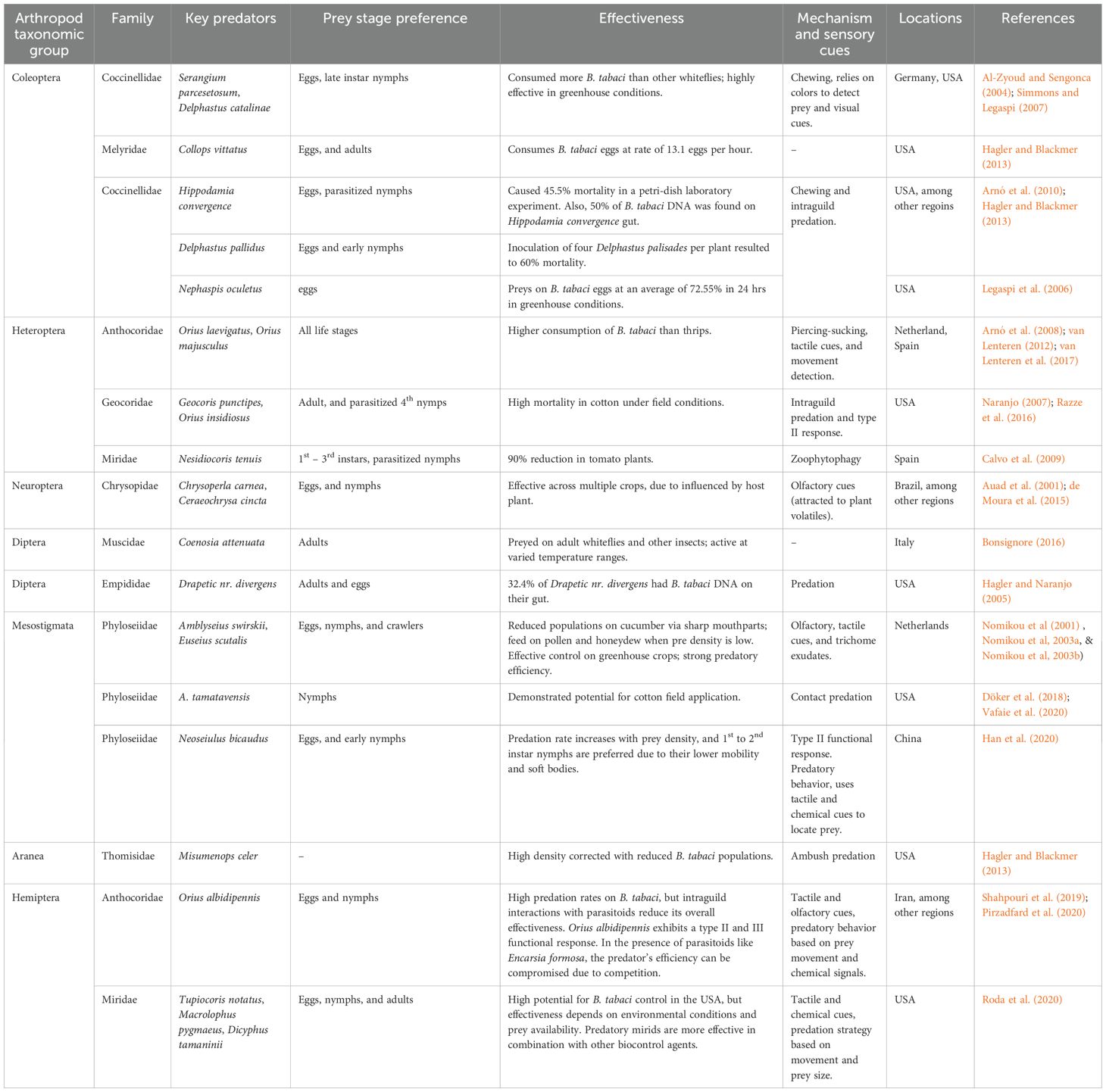 Abubakar et al. (2022) reported that more than 150 species of natural enemies have been identified, although comprehensive evaluations have been limited to only a few taxonomic groups. A diverse range of naturally occurring predators for B. tabaci has been identified, but only a limited number have been studied and assessed for biocontrol effectiveness (Arnó et al., 2008; Calvo et al., 2009; Cardoso et al., 2025) (Table 1). Key predators on B. tabaci include coccinellid beetles, lacewings, mirid bugs, predatory mites, and anthocorids (Li et al., 2021a) (Table 1). The coccinellid Delphastus catalinae (Horn) (Coleoptera: Coccinellidae), D. pusillus (LeConte) and predatory mites Amblyseius barkeri (Hughes) (Acarina: Gamasida: Phytoseiidae) and A. cucumeris (Oudemans) as well as Neoseiulus bicaudus (Wainstein) (Acari: Phytoseiidae) have been widely utilized in greenhouse conditions and have demonstrated significant effectiveness in decreasing B. tabaci populations on tomato among other plants (Al-Zyoud and Sengonca, 2004; Simmons and Legaspi, 2007; Han et al., 2020). Likewise, introducing six Macrolophus pygmaeus Rambur (Hemiptera: Miridae), per plant substantially reduced whitefly populations in watermelon (Abubakar et al., 2022). In regulated greenhouse conditions, Nesidiocoris tenuis Reuter (Hemiptera: Miridae), suppressed whitefly populations by more than 90% on tomato plants (Calvo et al., 2009). However, its efficacy against whiteflies feeding on sweet peppers was negligible (Legaspi et al., 2006). Additionally, Chrysoperla carnea (Stephens) (Neuroptera: Chrysopidae), green lacewing, has been shown to manage B. tabaci when introduced at a density of 10 adults per plant in tomato greenhouses. Moreover, the synergistic use of C. carnea, Orius albidipennis Reuter (Hemiptera: Anthocoridae), and Phytoseiulus persimilis Athias-Henriot (Acari Phytoseiidae), a predatory mite, augmented the control of pests and increased cucumber production (Hagler and Naranjo, 2005; Arnó et al., 2008, Arnó et al., 2010). Table 1 shows a summary of the key predators of B. tabaci with notes on their preference and effectiveness. Additionally, certain species, such as Dicyphus hesperus Knight (Hemiptera: Miridae), have been shown to reduce B. tabaci egg and nymph populations by up to 60%, with the most significant impact observed during the nymphal stages (Smith and Krey, 2019). Similarly, some species, like Serangium parcesetosum Sicard (Coleoptera: Coccinellidae), suppress the B. tabaci population within six weeks of release on Euphorbia pulcherrima plants (Ellis et al., 2001; Kheirodin et al., 2020), while A. tamatavensis (predatory mite) colonized nightshade infested with B. tabaci, and has the potential to be utilized as a predator against this pest (Döker et al., 2018) (Table 1).