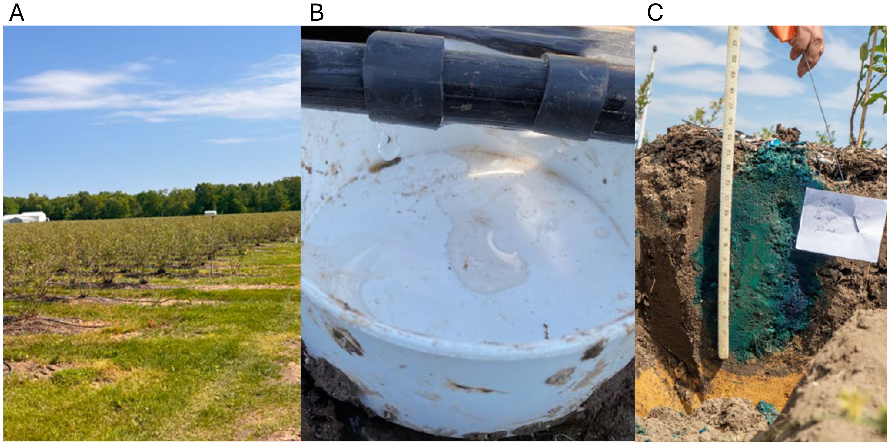 Figure 1. A commercial blueberry field in West Olive, MI, USA (A). The catch can setup to measure the water flow rate (B). A blue dye test measuring the area of the wetting region from a single emitter (C).
