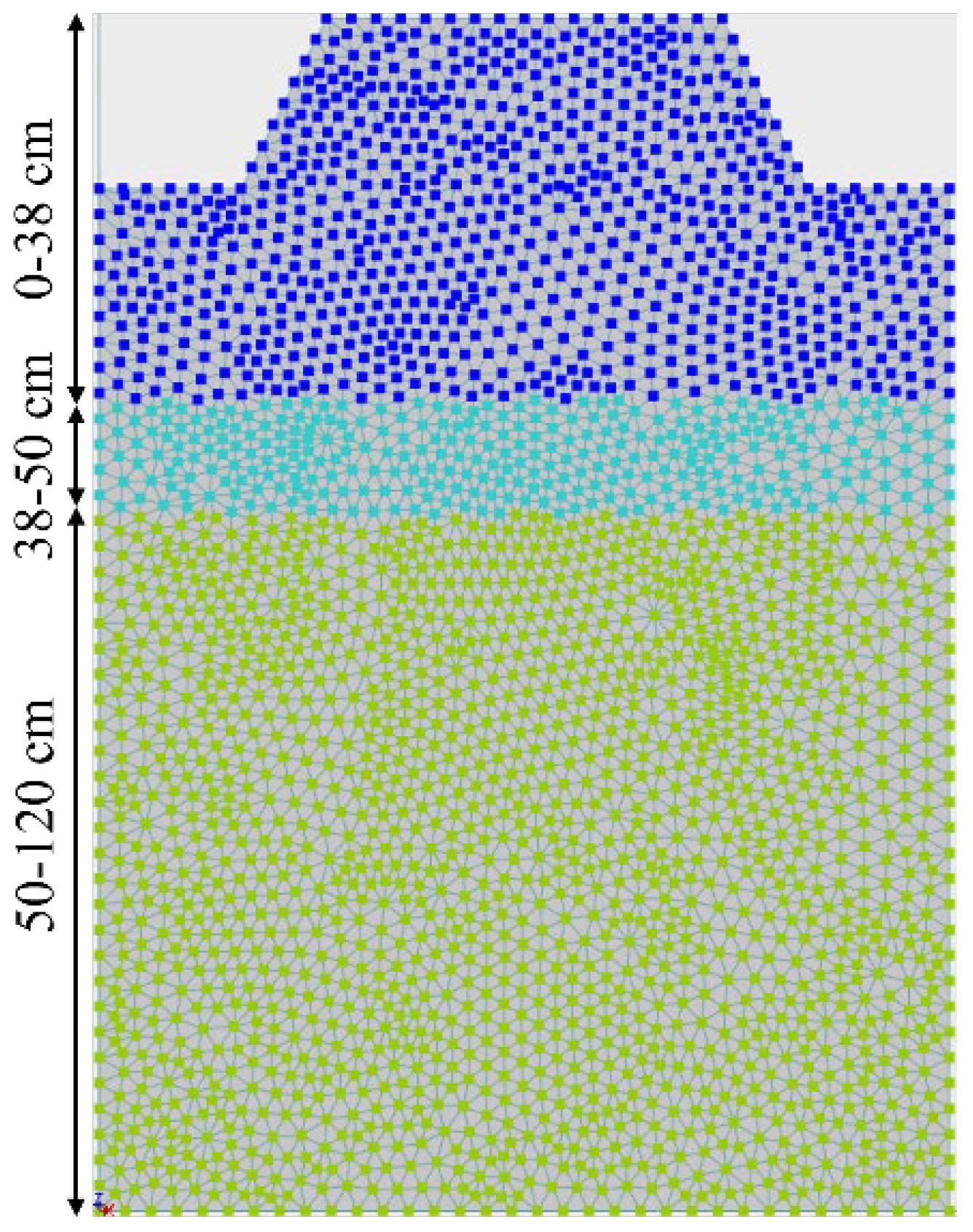 Figure 2 shows the depth ranges of the three soil layers estimated by the HYDRUS-2D software. The irrigation application areas were selected as a variable flux boundary condition. Time-variable boundary conditions were used to apply irrigation at different times. Two geometry drawings were used in this study to observe two dimensions of water flow in soils. Figure 3 shows the front and side views of the soil beneath a row of blueberry plants in a typical blueberry field. The irrigation area on the boundary was identified using blue dye test results.
