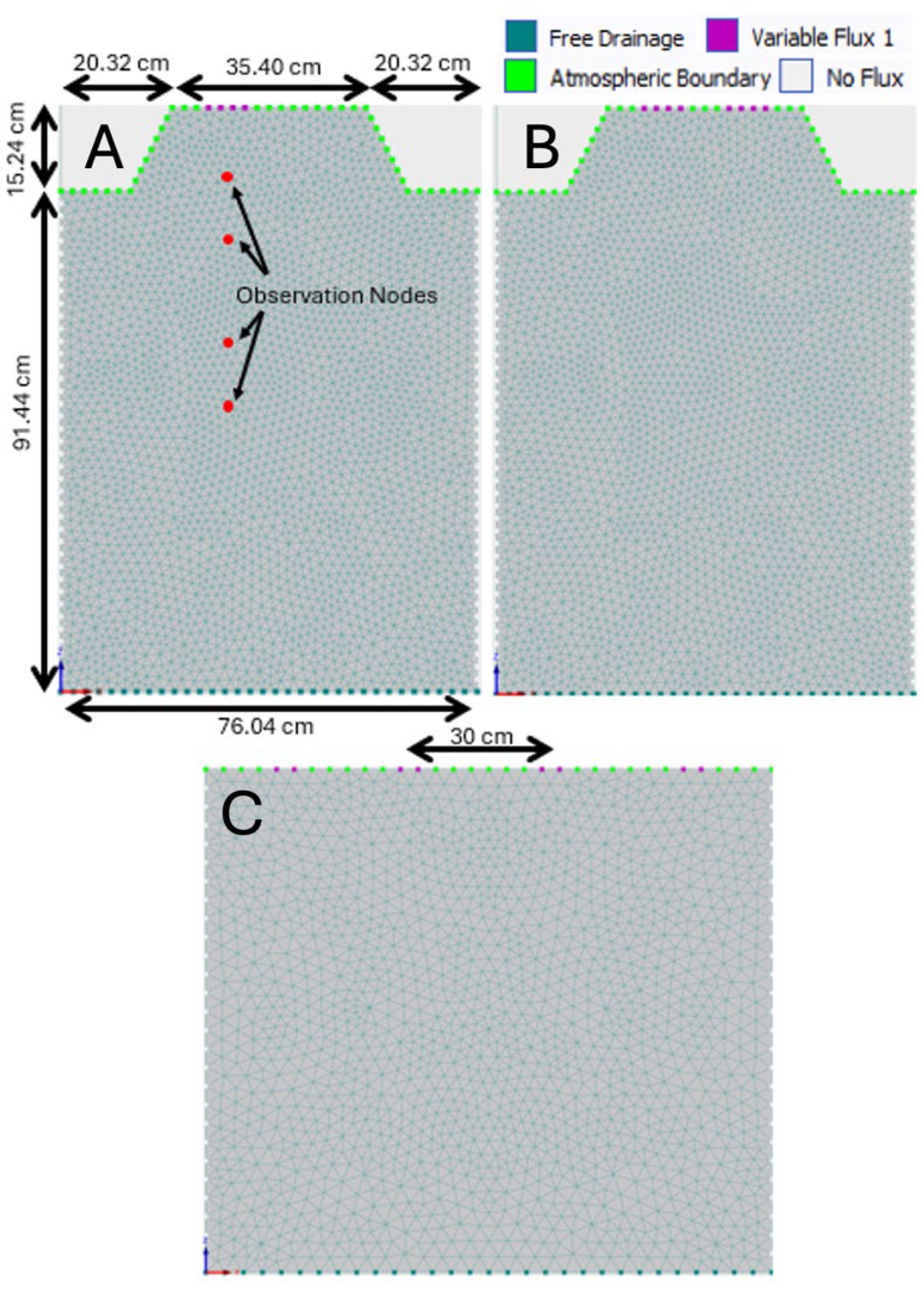 Figure 3. Flow domain and finite element mesh in HYDRUS-2D for the front view and side view of the finite element mesh for a single drip line (A), double drip line (B), and 30-cm emitter spacing (C). The observation nodes in the model coincide with the infield sensor installations at 15-, 25-, 45-, and 55-cm depths.