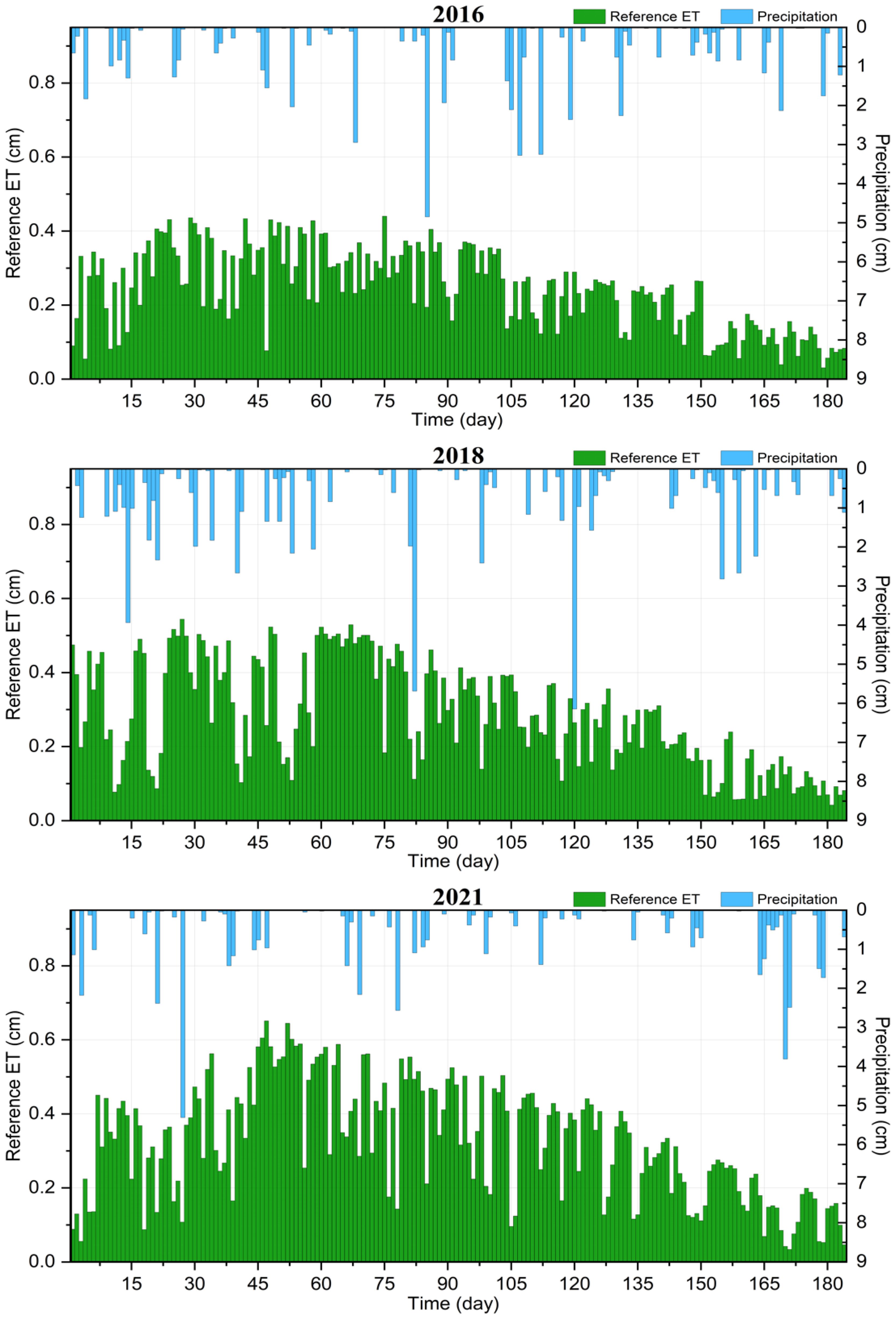 Figure 4. The value of reference ET and precipitation collected from the Michigan State University Enviroweather station in Grand Junction, MI, for the average growing season (2016), the wet season having the highest precipitation amount (2018), and the dry season having the lowest precipitation amount (2021).
