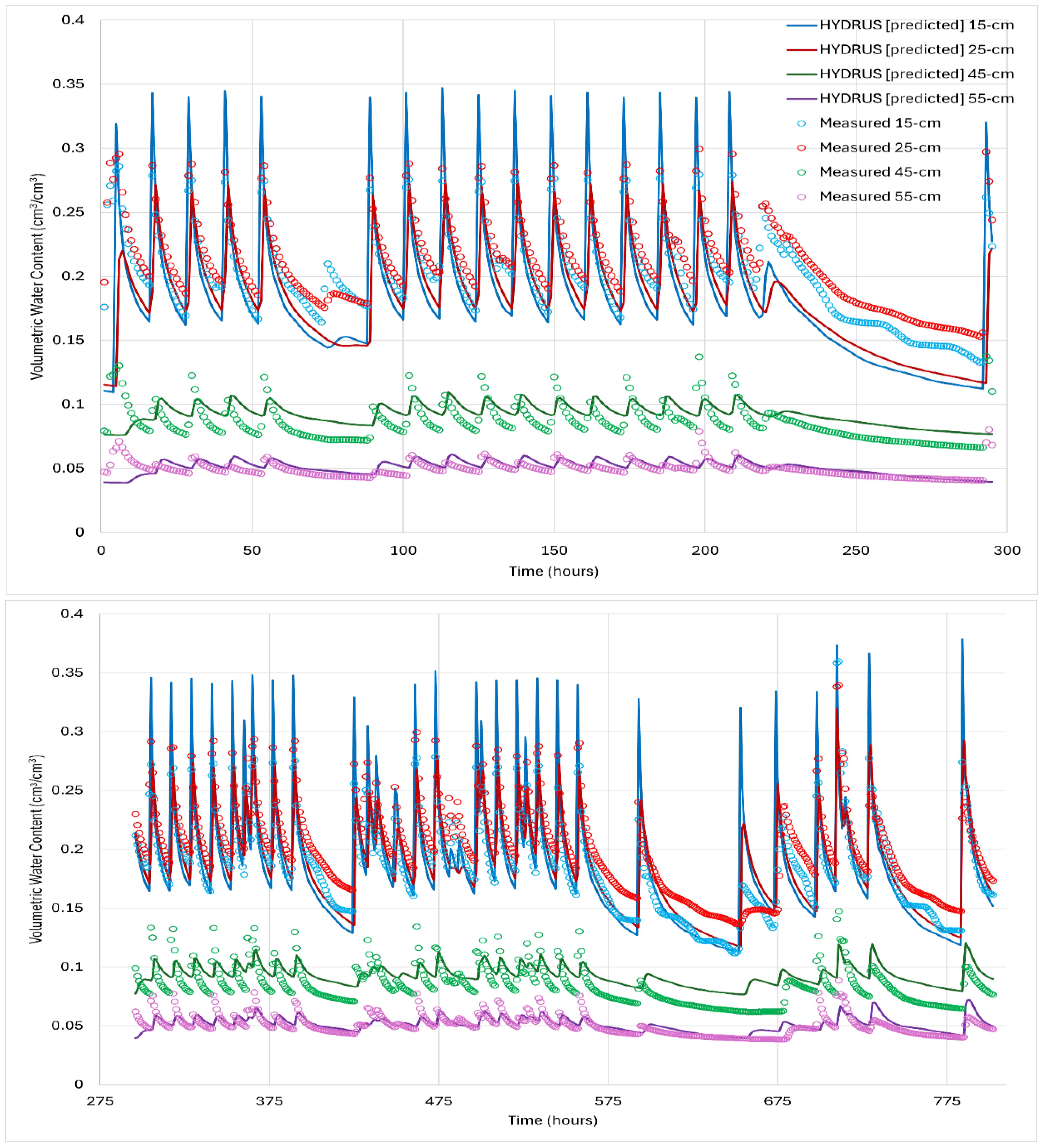 Figure 5. Comparison of the fitted HYDRUS-2D model with the measured volumetric water content from the infield sensors at 15, 25, 45, and 55 cm soil depths for calibration (top) and validation (bottom); 3,216 total data points were used for the calibration and validation process.