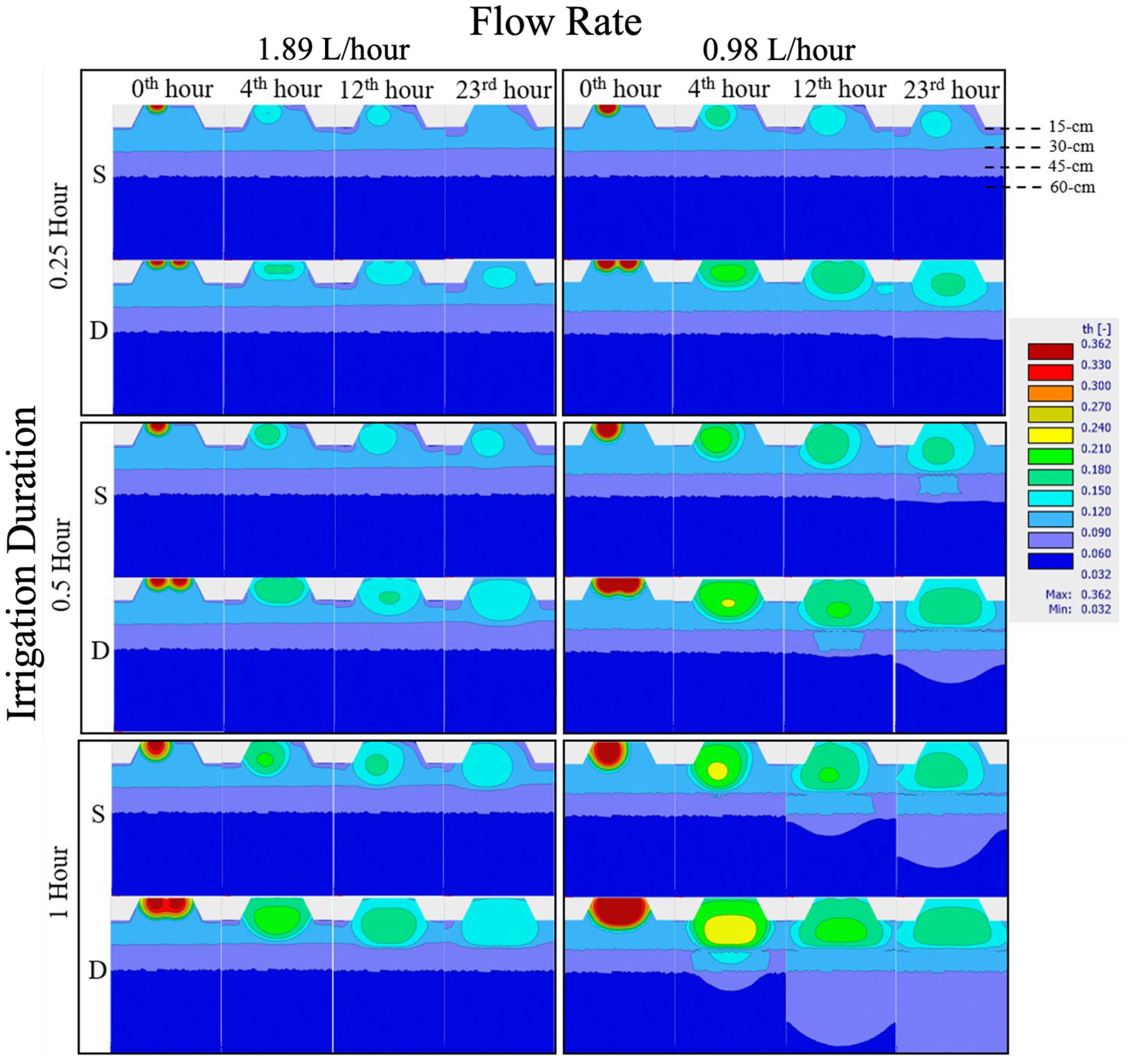 Figure 6. The effect of the drip irrigation system on coverage of the root zone after different times using different flow rates and different irrigation durations, as well as comparing single (S) and double (D) drip. The legend on the right relates color to soil moisture content.