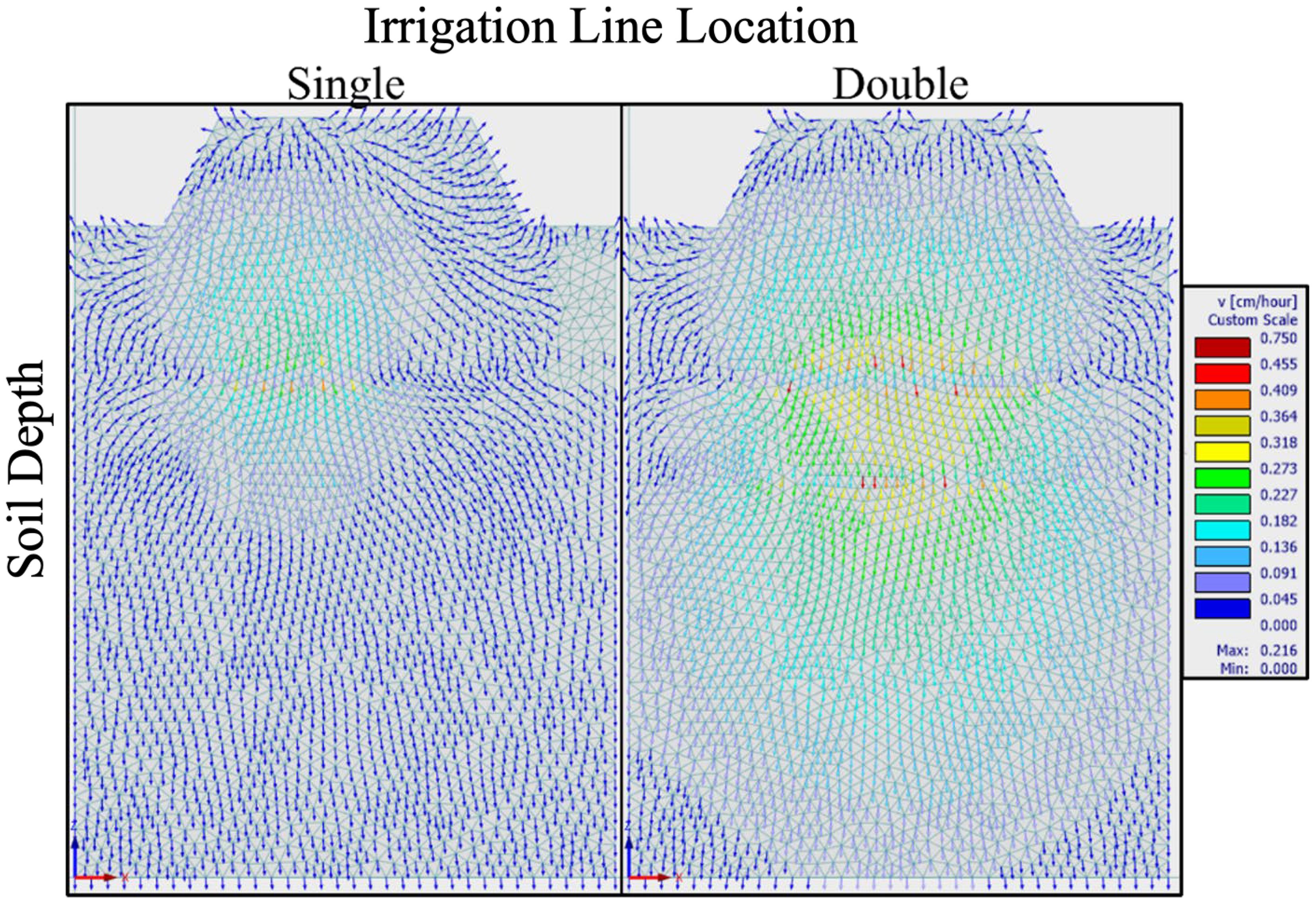 The direction of water flow was also investigated using single and double drip lines with a flow rate of 1.89 L/h (Figure 7). With a single drip line, the movement of water can be seen evenly throughout the hill, but slower on the side without the drip. The increased amount of water from the double drip line produced water flow throughout the hill and caused faster infiltration downward. Evapotranspiration can be seen in the model with velocity vectors pointing up at the surface.