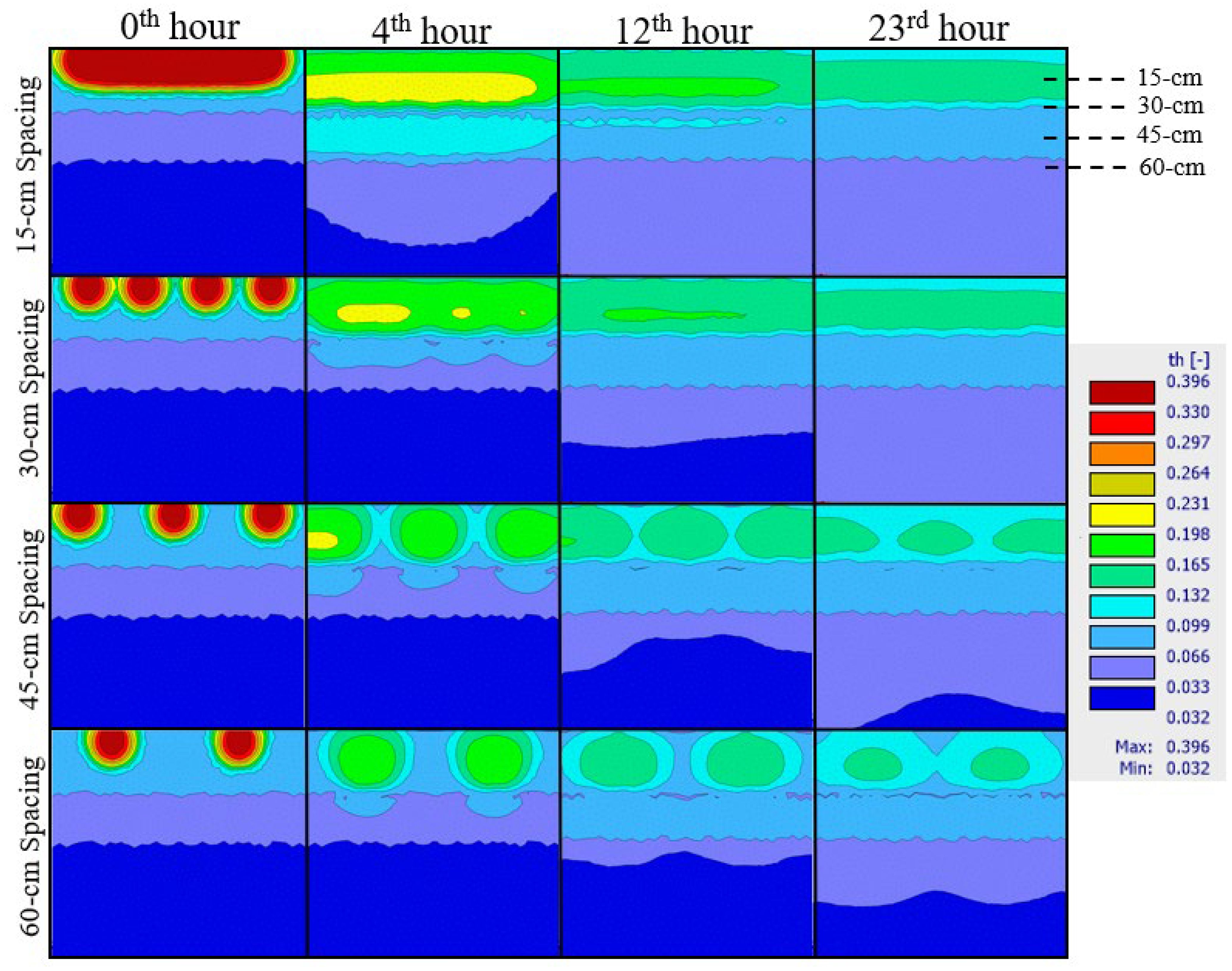 Drip emitter spacing is one of the most influential design parameters in drip irrigation systems, directly affecting the soil moisture distribution (Bajpai and Kaushal, 2020). A major result from this study showed that the pattern of soil wetting is governed not only by emitter flow rate and irrigation duration but also by the distance between emitters along the drip line. Optimal emitter spacing ensures uniform water distribution, reduces water losses due to deep percolation, and enhances crop water use efficiency. A flow rate of 1.89 L/h with emitter spacing at 15, 30, 45, and 60 cm for 1 h influenced the distribution of soil moisture. Closer emitter spacing (15 and 30 cm) led to excessive overlaps of wetting fronts, causing significant water loss beyond the root zone. The comparative evaluation of 30- and 45-cm emitter spacings indicated that both maintained sufficient soil moisture within the effective rooting depth. However, the 45-cm emitter spacing exhibited optimal irrigation application efficiency, as it reduced the number of emitters and overall water volume, without compromising the uniformity or adequacy of moisture distribution in the root zone. Drip emitters with 60-cm spacing were spaced too widely, and unanticipated water percolation occurred as the region below the emitter may have become oversaturated. Leaching of pesticides and fertilizers can be caused by this deep percolation, leading to decreased crop production and yield (Ma et al., 2020). Similarly, the findings indicated that using an emitter spacing of 30 cm compared to 40 cm in a cotton–wheat cropping system could be more effective for increasing water productivity and yield (Yamini and Singh, 2024). Kwon et al. (2020) evaluated soil water distribution patterns between two surface drip emitters using field experiments and HYDRUS-2D simulations. Emitters were spaced at 20, 40, and 60 cm, with soil moisture measured by FDR sensors. Water content increased and saturated faster at shorter spacing (20 cm: 30–200 min) compared to wider spacing (60 cm: 900 min to over 22 h). Simulations closely matched field data (R² = 0.97). These findings help optimize drip irrigation design for improved vegetable crop productivity.