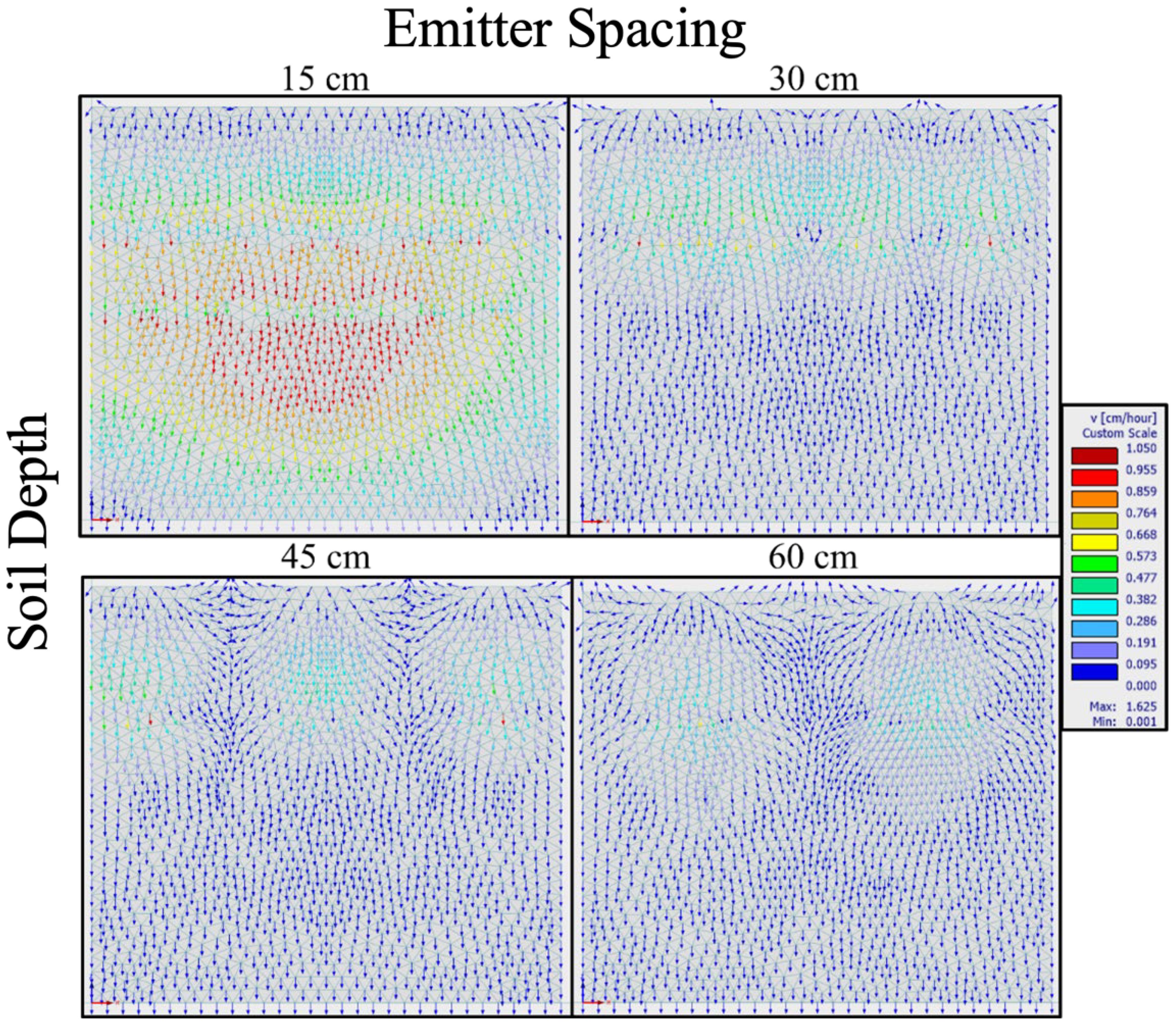 Figure 9. A comparison of the velocity vectors of water movement at 4 h after an hour duration of 1.89 L/h drip irrigation with emitter spacing of 15, 30, 45, and 60 cm. Legend on the right relating color to the velocity of water movement.