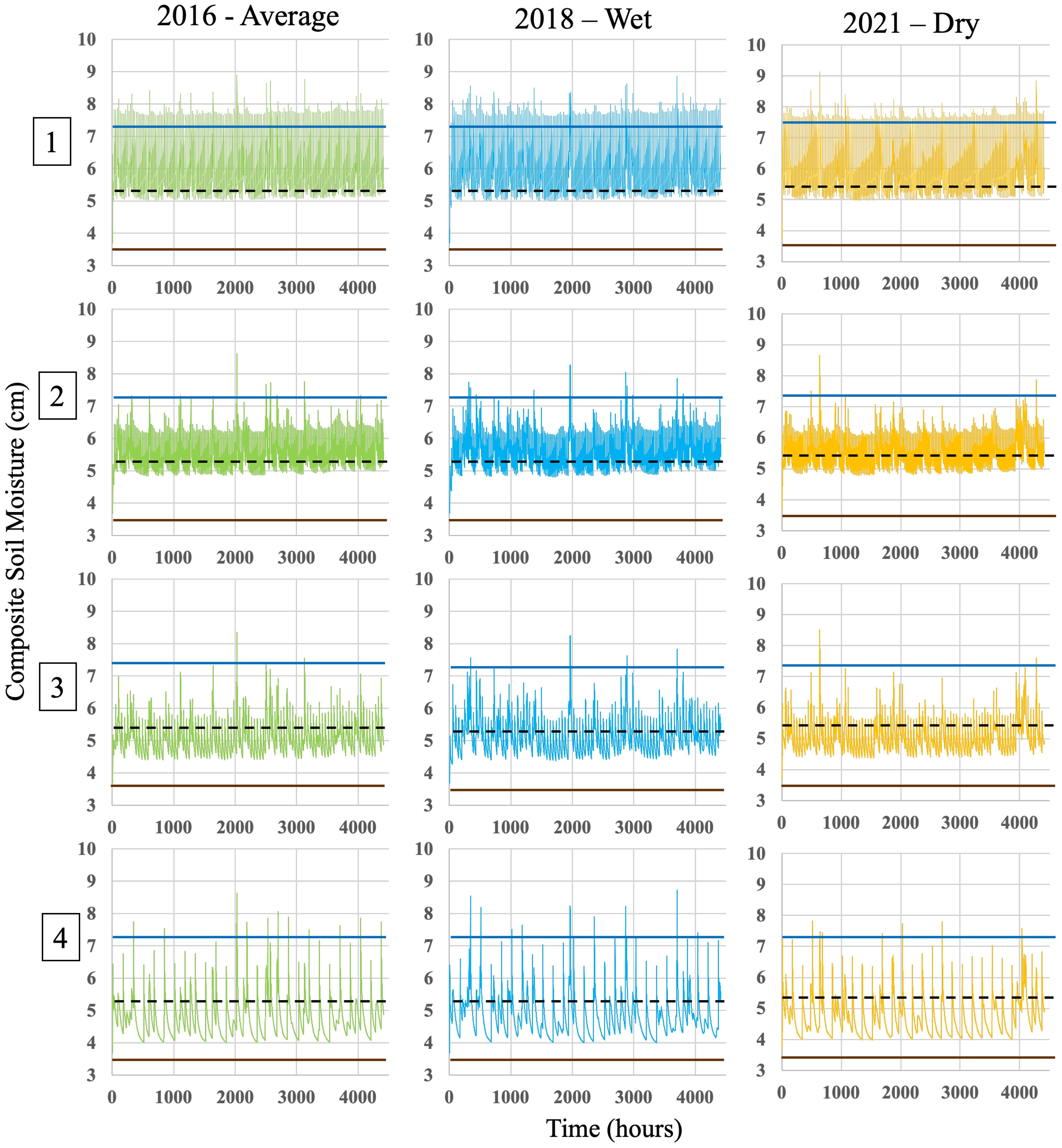 Figure 10. The change in composite soil moisture for the top 60 cm of soil throughout the average, wet, and dry growing seasons under the different irrigation treatments 1 to 4, all using a flow rate of 1.89 L/h with a 60-cm emitter spacing. The PWP (brown line), FC (dark blue line), and recommended irrigation trigger point (dashed line) are imposed on the figure. Treatment numbers are displayed on the left.