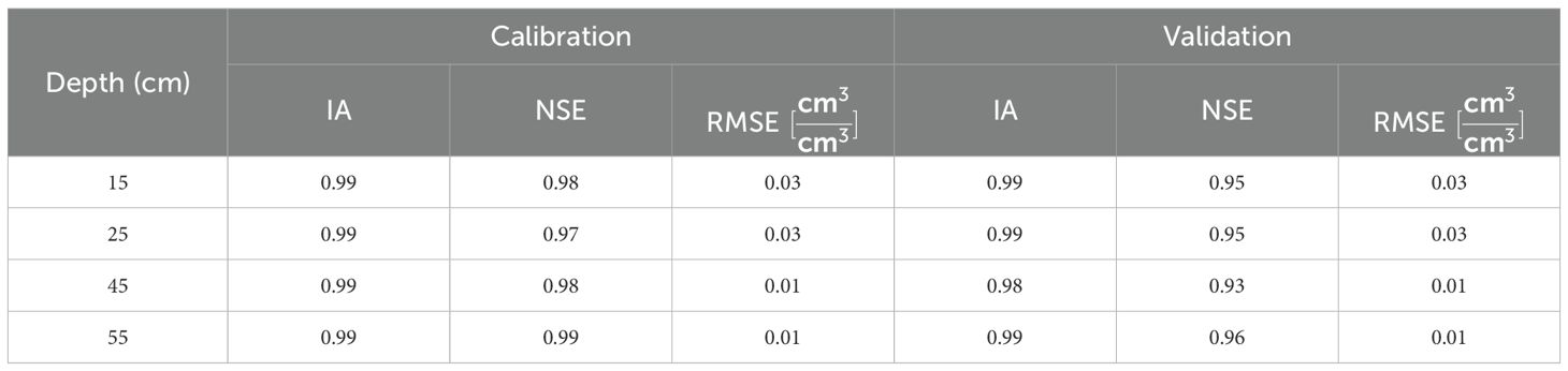 Defining the criteria for evaluating model performance is important. A range of recommended values was used in different studies including NSE >0 (Qiao, 2014), >0.12 (Skewes and Phogat, 2015), and >0.5 (Arora et al., 2011; Anlauf and Rehrmann, 2013). For IA, Phogat et al. (2016) and Dong et al. (2019a) reported IA >0.8 as an acceptable IA value (Skewes and Phogat, 2015; Dong et al., 2019a). For RMSE, there is a range of values reported that represent satisfactory results, and these include 0.0135 (Shekofteh et al., 2013), 0.12 (Wang et al., 2016), 0.14 (Dong et al., 2019a), and 0.03 (Ramos et al., 2012). Absolute measured error and relative error measurements were both considered to evaluate model performance (Legates and McCabe, 1999; Wegehenkel and Beyrich, 2014). This study evaluated the model calibration performance based on NSE ≥0.5, IA ≥0.8, and RMSE ≤0.030. The NSE, IA, and RMSE were calculated with Microsoft Excel software.