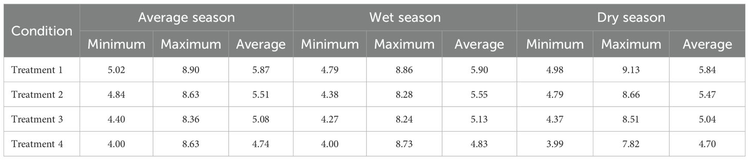 The change in composite soil moisture was plotted for each of the three growing seasons, under the four different irrigation treatments of interest. Each growing season was then evaluated by comparing the graphs to the FC and permanent wilting point (PWP) values. The FC and PWP were calculated for the top 60 cm of soil by assuming it to be loamy sand (Dong et al., 2020). The PWP was found to be 3.4 cm, FC to be 7.2 cm, and the recommended irrigation trigger value, at the 50% threshold, to be 5.3 cm (Figure 10). In addition, Table 3 presented the minimum, maximum, and average composite soil moisture content under each treatment of the growing season. Treatment 1 under each weather condition kept the soil moisture near or above the 50 threshold. Treatments 3 and 4 are both near the calculated PWP, being more frequent in both the dry and average years compared to the wet year, which would leave the plant under water stress. Under treatment 2, although the composite water content dips below the 50% threshold for each irrigation instance, this system does not water past or to FC, thus saving water. This treatment works best under the conditions of a wetter growing season, with the composite soil water going below the recommended irrigation point less frequently than in the other years.