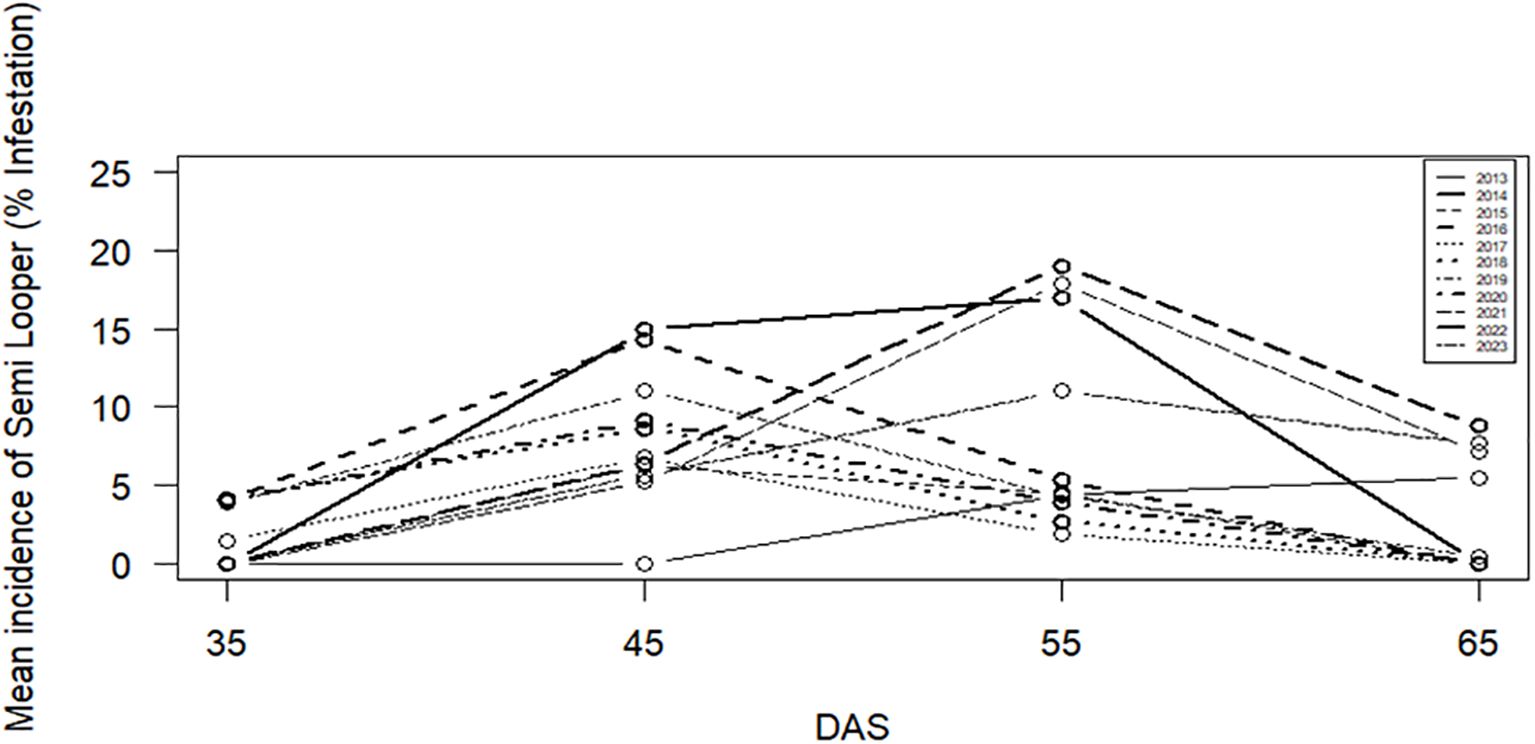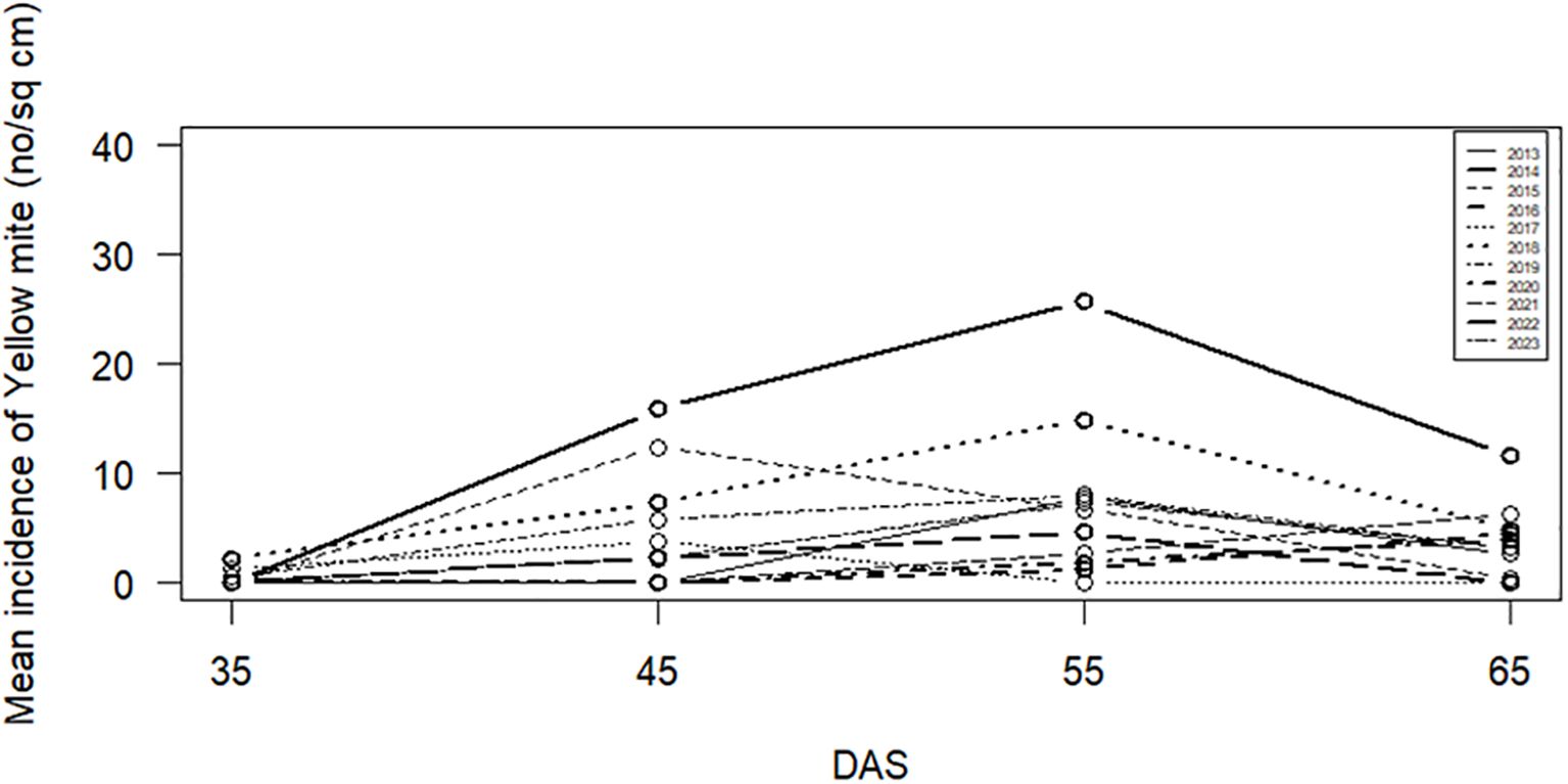 The seasonal plots of yellow mite and jute semilooper are presented in Figures 1 and 2, respectively. For both pests, peak incidence is observed on 55 DAS followed by 45 DAS. The results of the WO test in Table 2 indicate that seasonality is present for jute semilooper but is absent for yellow mite.