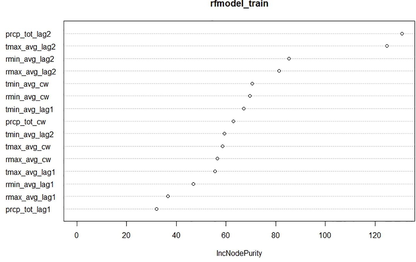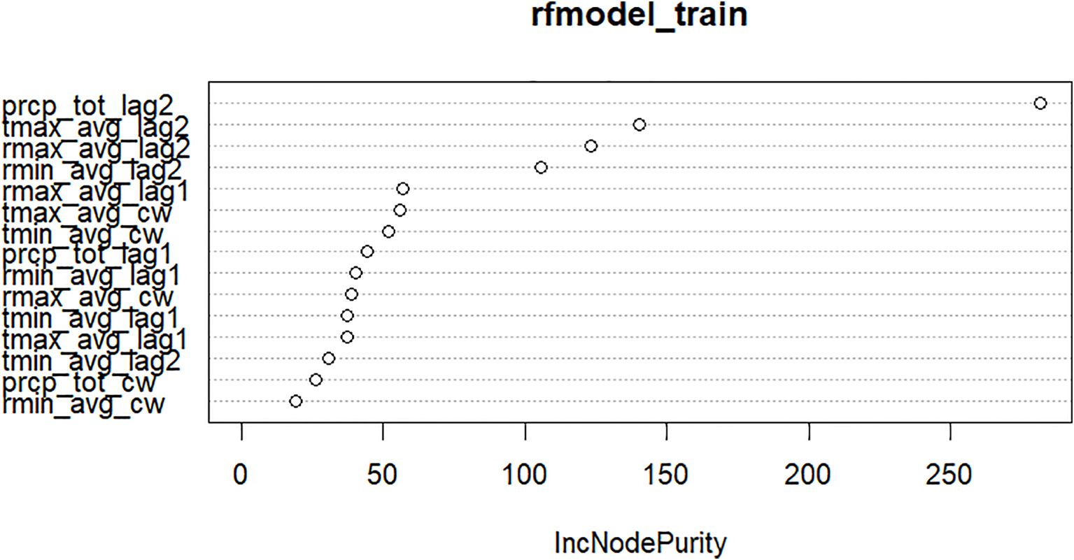 Random Forest relies on two key algorithms: bagging and random feature selection. Bagging involves selecting a specified number of samples (ntree) from the dataset using simple random sampling with replacement (SRSWR) to construct multiple trees. Random feature selection determines the number of variables (mtry) to consider at each split. The hyperparameters of the fitted Random Forest model are provided in Table 10. The Random Forest model also evaluates the % increase in node impurity (IncNodePurity) to identify important variables. For predicting the mean incidence of yellow mite, rainfall and MaxT at a 2-week lag are identified as significant weather variables, as shown in Figure 3. Similarly, for predicting the jute semilooper incidence, rainfall and MaxT at a 2-week lag are also recognized as important weather variables, as shown in Figure 4. The key weather variables identified from the variance importance plot in the Random Forest model, rainfall and MaxT at a 2-week lag, are used as exogenous variables in both the SVR and TDNNX models.