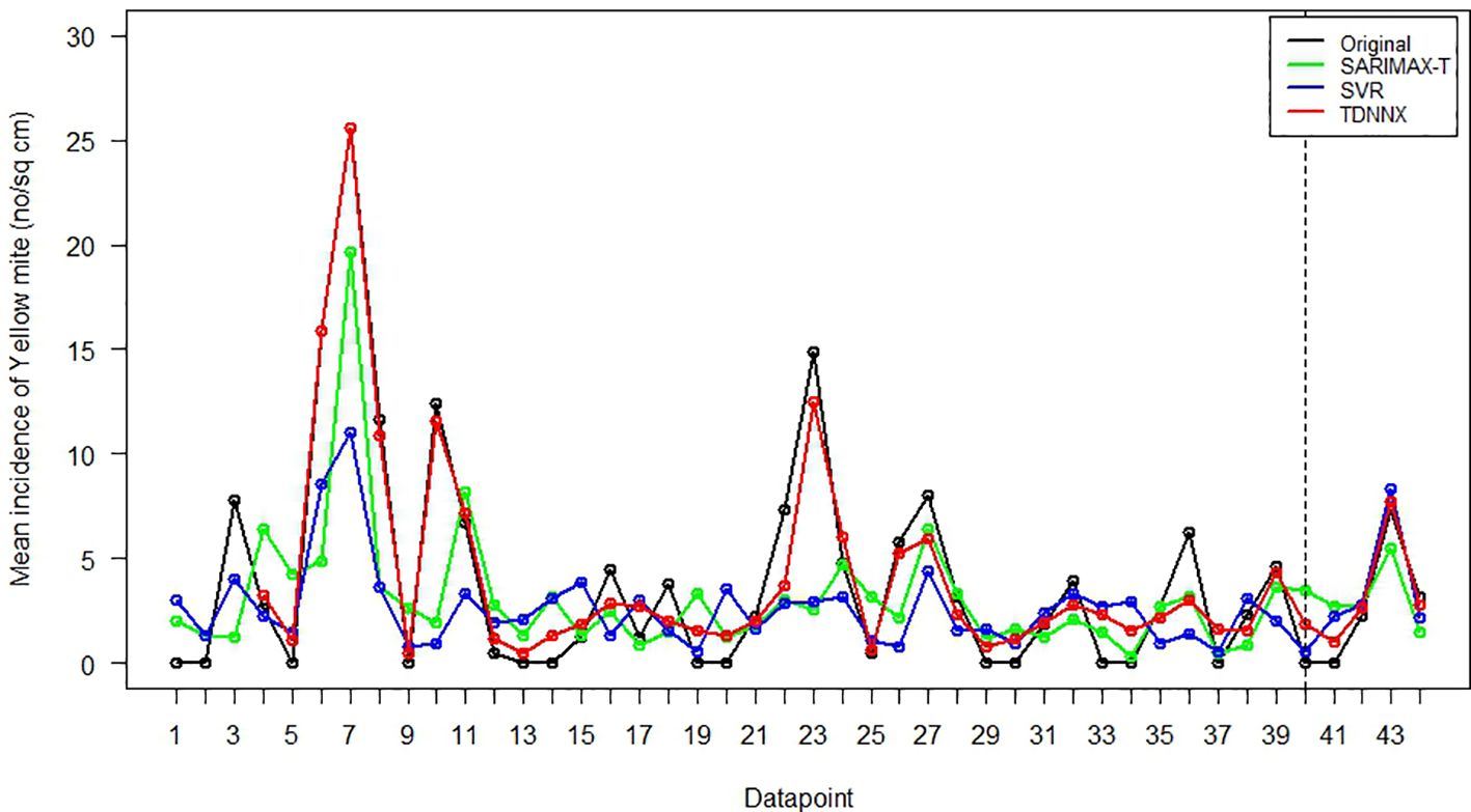 Figure 5. Plot of observed vs. fitted values by SARIMAX-T, SVR, and TDNNX models for yellow mite incidence.